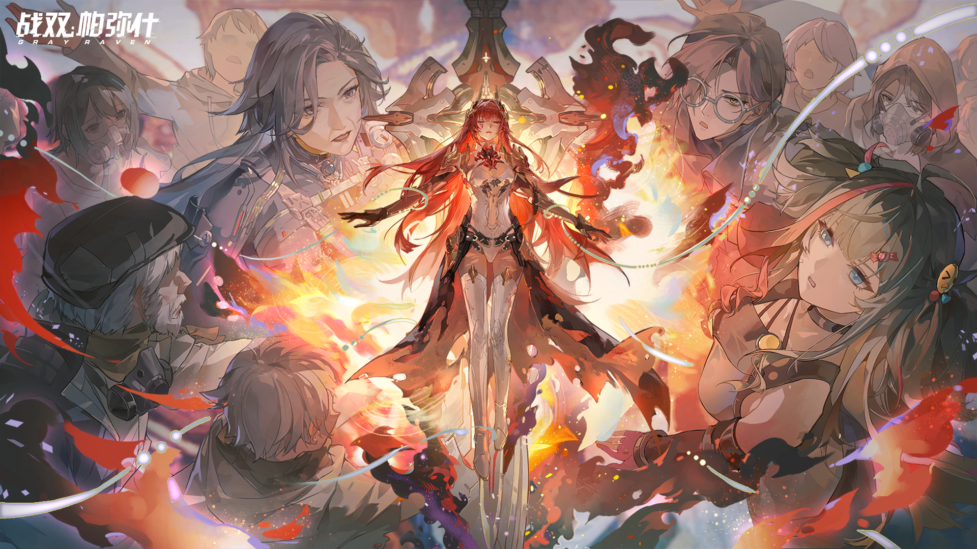 artist_request beard facial_hair fire gas_mask glasses grey_hair hat highres hood long_hair mask mechanical_arms official_art punishing:_gray_raven red_eyes red_hair simon_(pgr) vera:_geiravor_(pgr) vera_(pgr) white_hair