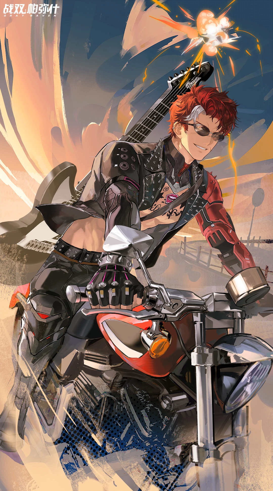 artist_request birthday black_jacket cloud explosion fence guitar happy_birthday highres instrument jacket leather leather_jacket looking_at_viewer mechanical_arms motor_vehicle motorcycle noctis:_indomitus_(pgr) noctis:_indomitus_(punk_dynamo)_(pgr) noctis_(pgr) official_alternate_costume official_art open_clothes open_jacket punishing:_gray_raven red_hair road_sign sign single_mechanical_arm sitting smile stop_sign sunglasses tattoo