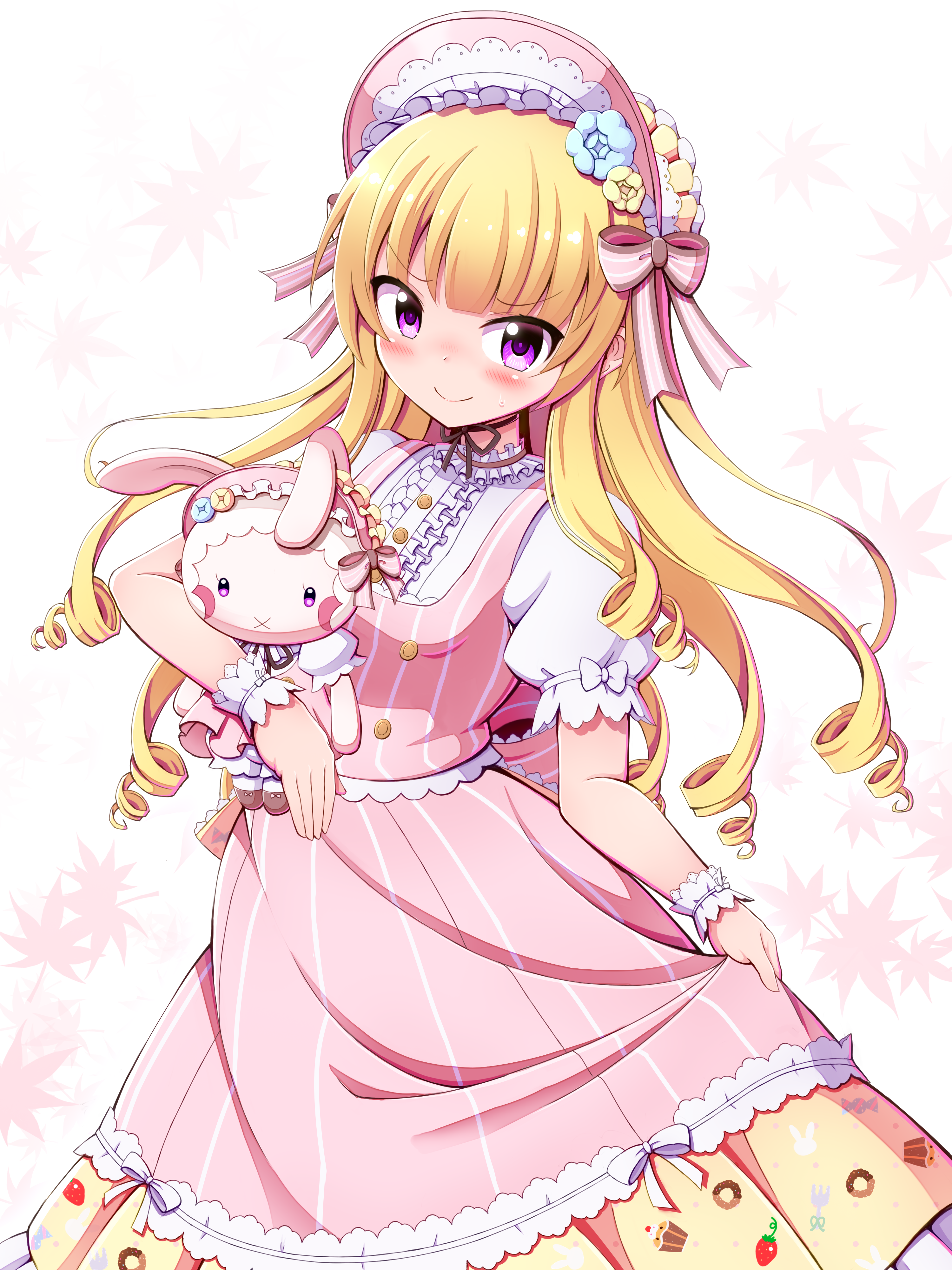 1girl absurdres battle_girl_high_school blonde_hair bonnet dress highres iwarihhi long_hair looking_at_viewer pink_dress pink_ribbon puffy_short_sleeves puffy_sleeves purple_eyes ribbon ringlets sendouin_kaede shirt short_sleeves solo stuffed_animal stuffed_rabbit stuffed_toy white_shirt