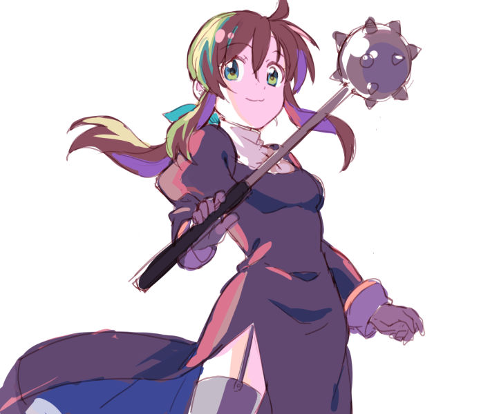 1girl black_dress black_thighhighs breasts brown_hair closed_mouth commentary_request cowboy_shot dress garter_straps green_eyes holding holding_mace holding_weapon juliet_sleeves long_hair long_sleeves looking_at_viewer mace medium_breasts ponytail priest_(ragnarok_online) puffy_sleeves ragnarok_online shatiko side_slit simple_background smile solo spiked_mace spikes thighhighs weapon white_background