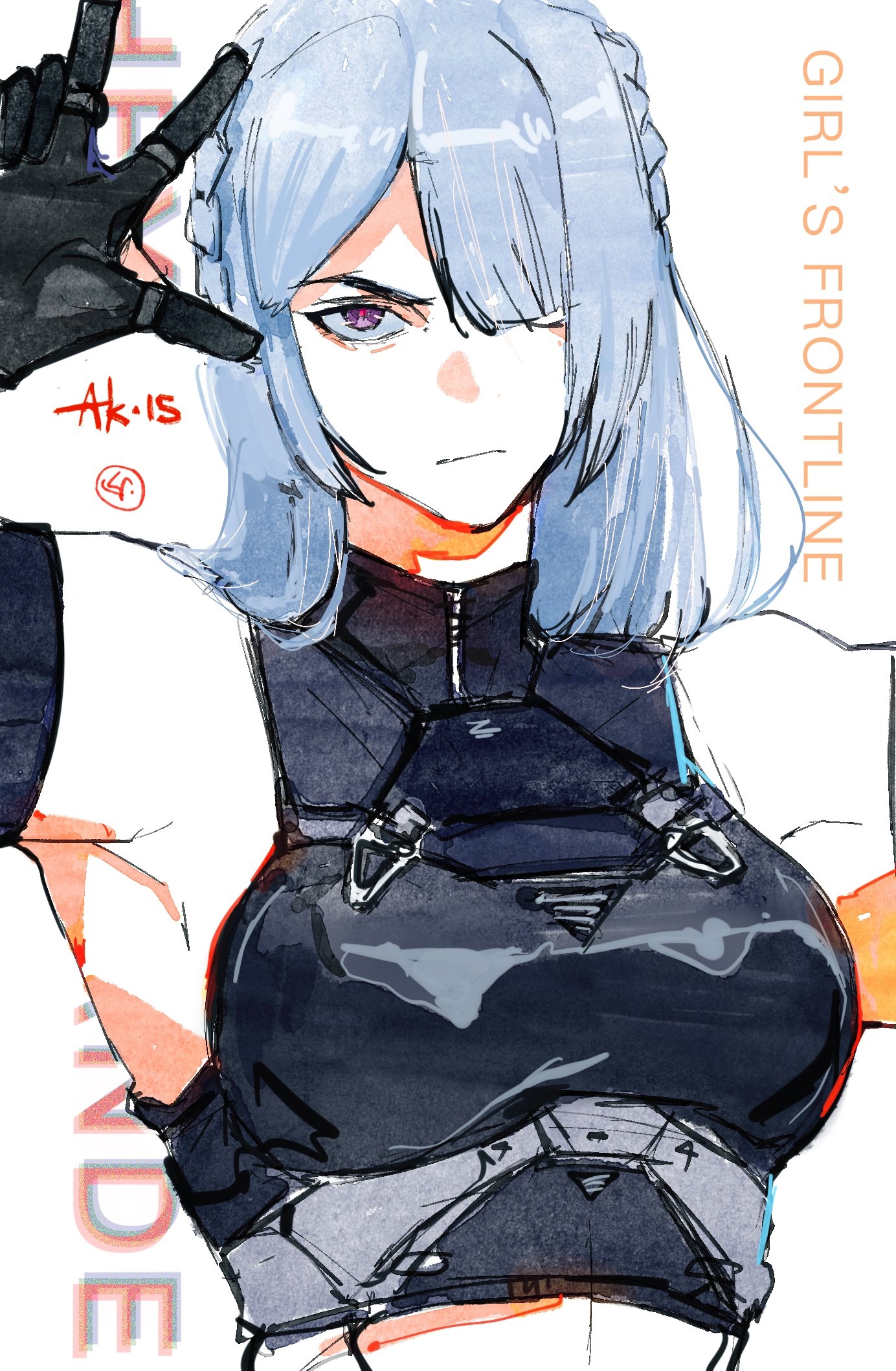 1girl ak-15_(girls'_frontline) arm_up breasts character_name commentary copyright_name english_commentary girls'_frontline grey_hair highres long_hair looking_at_viewer purple_eyes red_pupils simple_background solo umariellum upper_body white_background