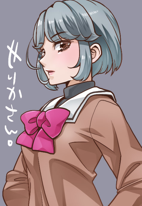 1girl bow brown_eyes brown_shirt grey_background grey_hair kamidou_arashi red_bow sailor_collar school_uniform shinjou_serika shirt short_hair solo tokimeki_memorial tokimeki_memorial_3 upper_body