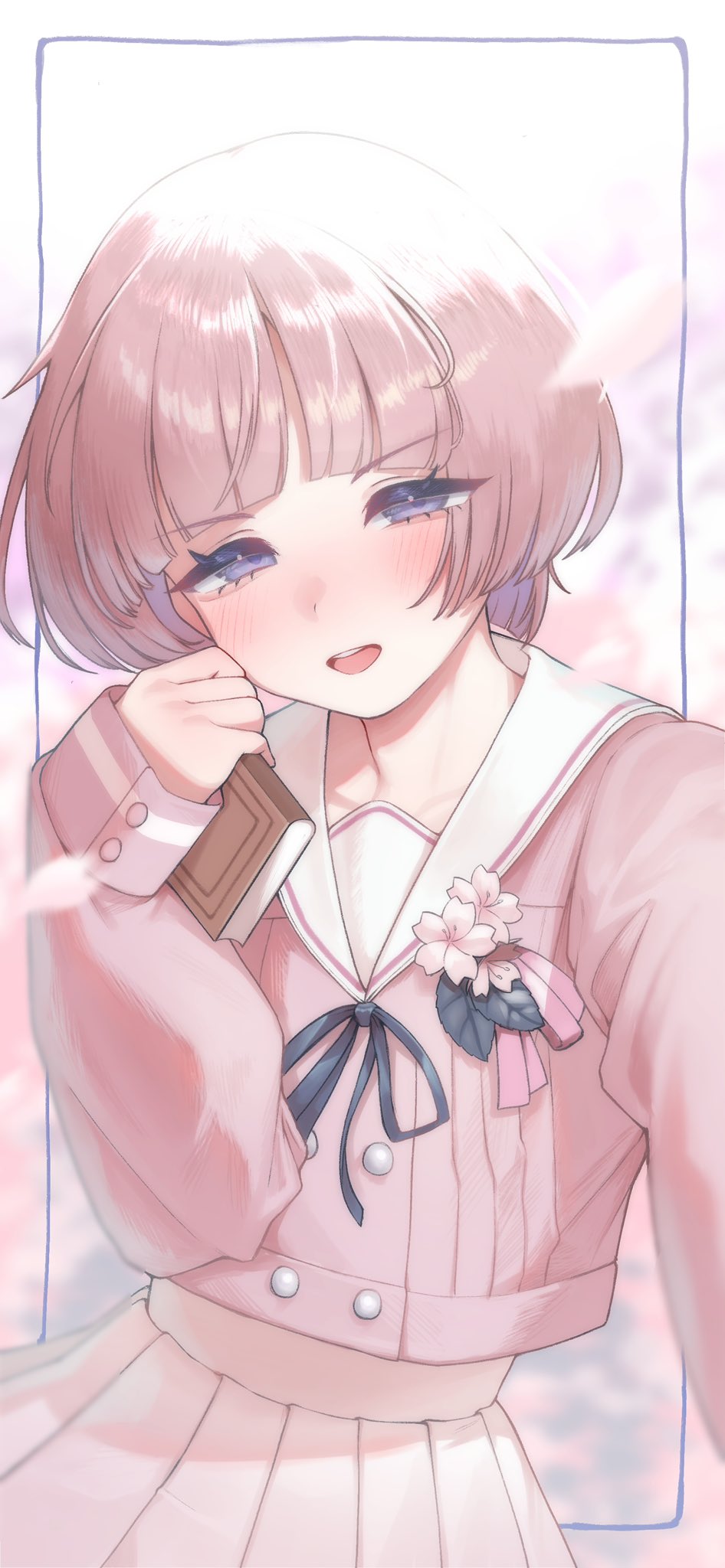1girl :o aegyo_sal arimura_mao bespectacled black_ribbon blunt_bangs blush book cherry_blossoms clenched_hand commentary falling_petals flower gakuen_idolmaster glasses half-closed_eyes hand_up highres holding holding_book idolmaster long_sleeves looking_at_viewer neck_ribbon official_alternate_costume open_mouth outdoors outside_border petals pink_flower pink_hair pink_serafuku pink_shirt pleated_skirt purple_eyes ribbon sailor_collar sakura_photograph_(idolmaster) school_uniform serafuku shirt shirt_ribbon short_hair skirt solo straight_hair untranslatable_commentary tareme teeth tsurumi_kazane upper_body upper_teeth_only v-shaped_eyebrows white_sailor_collar