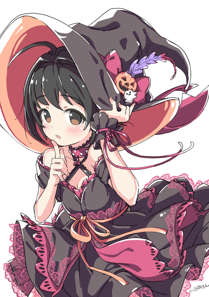 1girl :o ahoge bare_shoulders black_dress black_hair black_hat black_wrist_cuffs bow brown_eyes choker dress hair_intakes hand_on_headwear hat hat_bow idolmaster idolmaster_cinderella_girls index_finger_raised kohinata_miho kuresuku_(lessons) looking_at_viewer off-shoulder_dress off_shoulder open_mouth pink_bow pink_choker short_hair short_sleeves solo studded_choker teeth two-sided_fabric two-sided_headwear upper_teeth_only white_background witch_hat wrist_cuffs