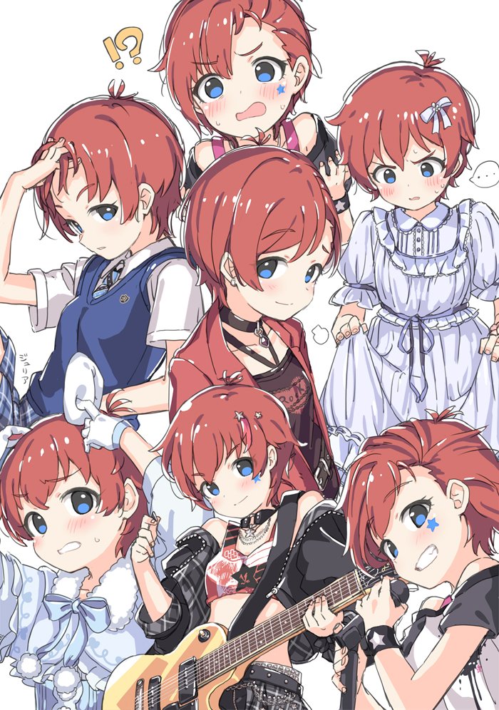 !? ... 1girl animal_ears antenna_hair arms_up black_choker black_jacket black_shirt black_skirt blue_bow blue_bowtie blue_capelet blue_dress blue_eyes blue_necktie blue_sweater_vest bow bowtie capelet choker collared_dress collared_shirt crop_top dress embarrassed facial_mark fake_animal_ears fur-trimmed_capelet fur_trim gloves guitar holding holding_guitar holding_instrument holding_microphone holding_own_dress idolmaster idolmaster_million_live! idolmaster_million_live!_theater_days instrument jacket julia_(idolmaster) julia_(meteor_bright_star)_(idolmaster) julia_(private_dress)_(idolmaster) kuresuku_(lessons) looking_down microphone midriff multiple_views necktie official_alternate_costume official_alternate_hairstyle open_clothes open_jacket plaid_clothes plaid_skirt private_dress_(idolmaster_million_live!) puff_of_air rabbit_ears red_hair red_jacket red_shirt shirt short_hair skirt speech_bubble spoken_ellipsis summer_highschool_(idolmaster) summer_uniform_series_(idolmaster) sweater_vest white_background white_gloves white_shirt