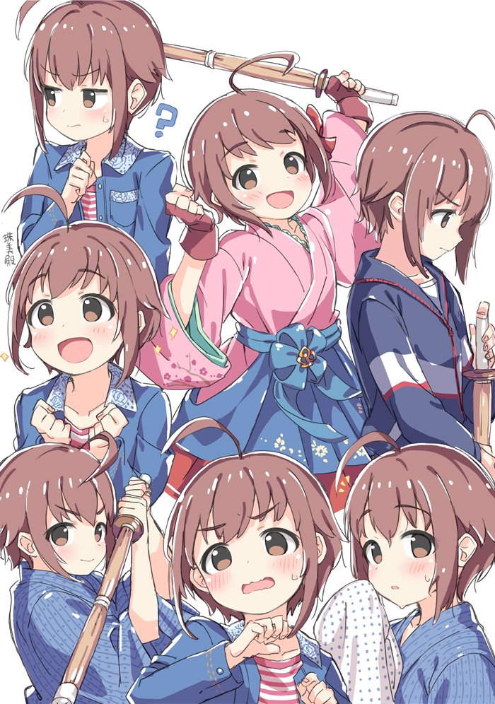 1girl ? ahoge blue_jacket blue_kimono brown_eyes brown_hair fingerless_gloves gloves holding holding_sword holding_weapon hood hood_down hooded_jacket idolmaster idolmaster_cinderella_girls jacket japanese_clothes kimono kuresuku_(lessons) long_sleeves multiple_views open_clothes open_jacket pink_kimono pink_shirt red_gloves shinai shirt short_hair sidelocks striped_clothes striped_shirt sword two-tone_shirt wakiyama_tamami weapon white_background white_shirt wide_sleeves