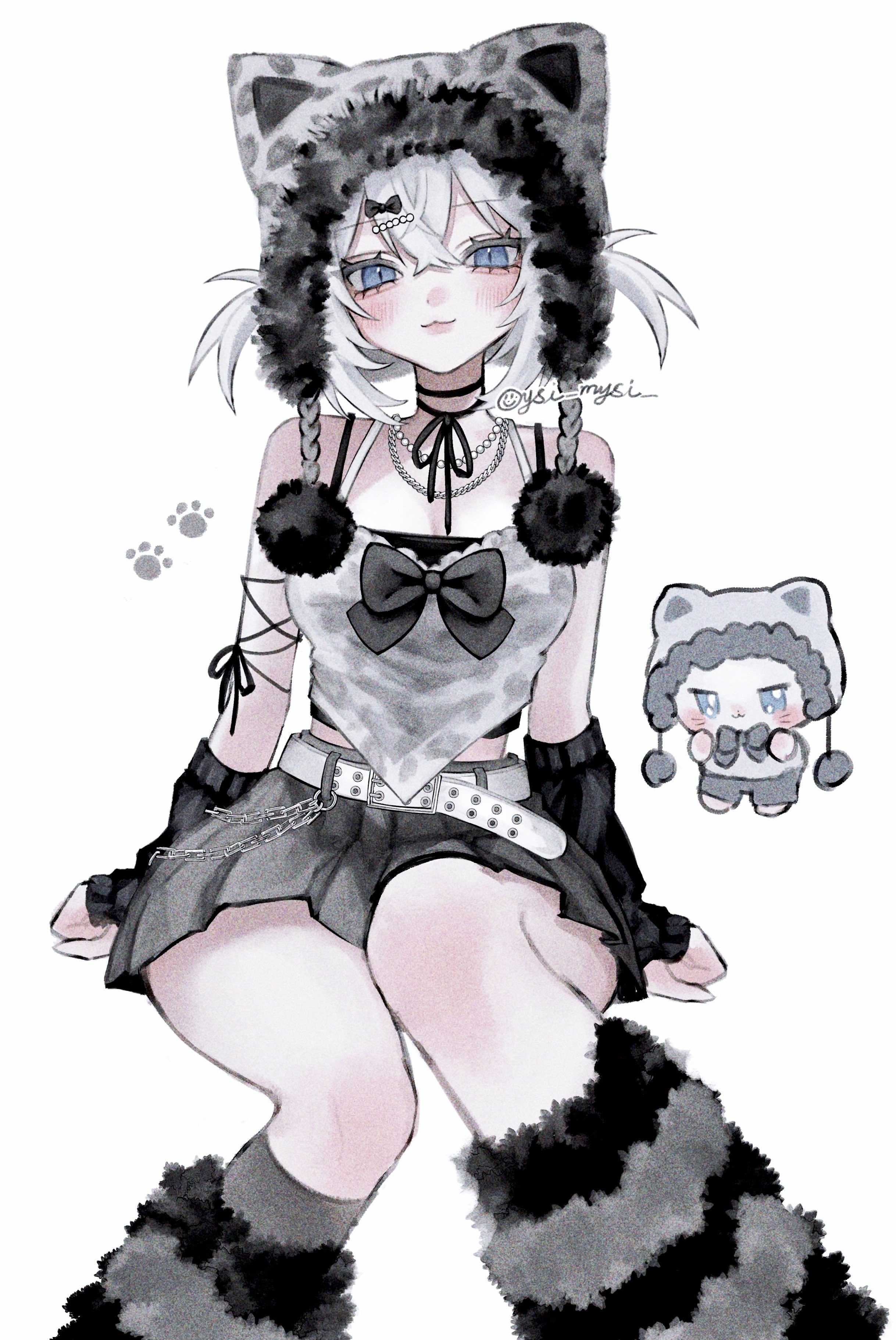 1girl :3 absurdres animal_hands arm_ribbon arm_warmers artist_name bare_shoulders belt black_arm_warmers black_bow black_choker black_leg_warmers black_ribbon black_sleeves black_tank_top blue_eyes blush bow breasts cat_girl cat_paws chain chibikemo choker cleavage commentary cowboy_shot crossed_bangs detached_sleeves dot_nose fingerless_gloves fur-trimmed_headwear fur_trim gloves grey_hat grey_skirt hair_between_eyes hair_bow hair_ornament hairpin hat hat_with_ears highres leg_warmers looking_at_viewer medium_breasts medium_hair midriff_peek neck_ribbon original oysi_mysi pom_pom_(clothes) ribbon shirt simple_background sitting skirt slit_pupils smile solo_focus striped_leg_warmers untranslatable_commentary tank_top undershirt white_background white_belt white_hair white_shirt yuki_(oysi_mysi)