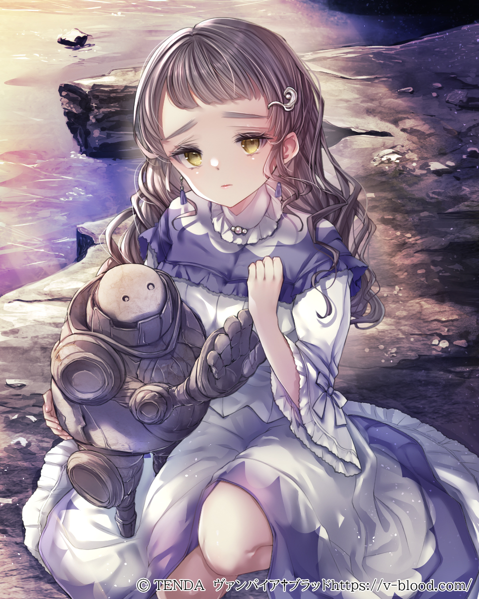 1girl blue_shirt blue_skirt brown_hair closed_mouth commentary_request copyright_name copyright_notice earrings evening frilled_skirt frilled_sleeves frills golem hair_ornament hane_segawa highres jewelry long_hair looking_at_viewer meir_sharl ocean official_art on_one_knee outdoors shirt skirt solo vampire_blood wide_sleeves yellow_eyes