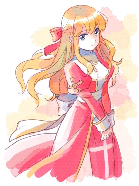 1girl back_bow blonde_hair blue_eyes bow breasts closed_mouth commentary_request cowboy_shot dress hair_bow high_priest_(ragnarok_online) juliet_sleeves long_hair long_sleeves looking_at_viewer medium_breasts puffy_sleeves ragnarok_online red_bow red_dress sash shatiko smile solo two-tone_dress white_background white_bow white_dress white_sash