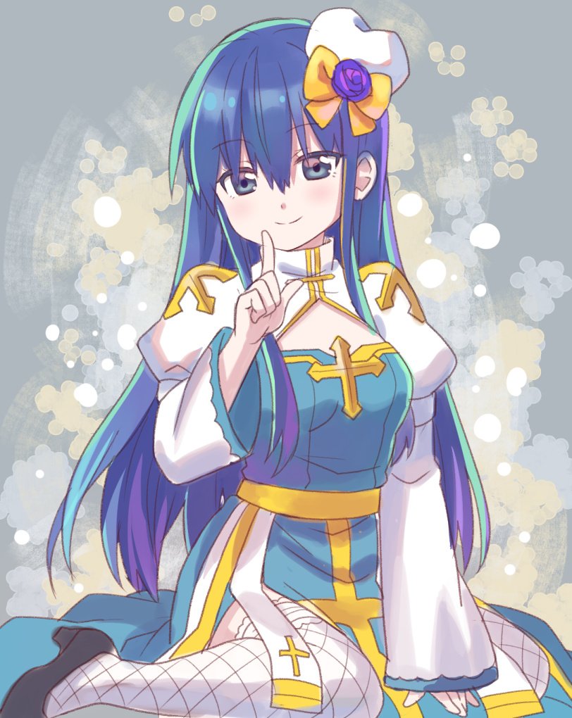 1girl arch_bishop_(ragnarok_online) beret black_shoes blue_dress blue_eyes blue_hair blush bow breasts cleavage_cutout closed_mouth clothing_cutout commentary_request cross dress fishnet_thighhighs fishnets flower frilled_thighhighs frills full_body grey_background hat hat_bow hat_flower high_heels index_finger_raised juliet_sleeves long_hair long_sleeves looking_at_viewer medium_breasts puffy_sleeves purple_flower purple_rose ragnarok_online rose sash shatiko shoes sitting smile solo thighhighs two-tone_dress wariza white_dress white_hat white_thighhighs yellow_bow yellow_sash