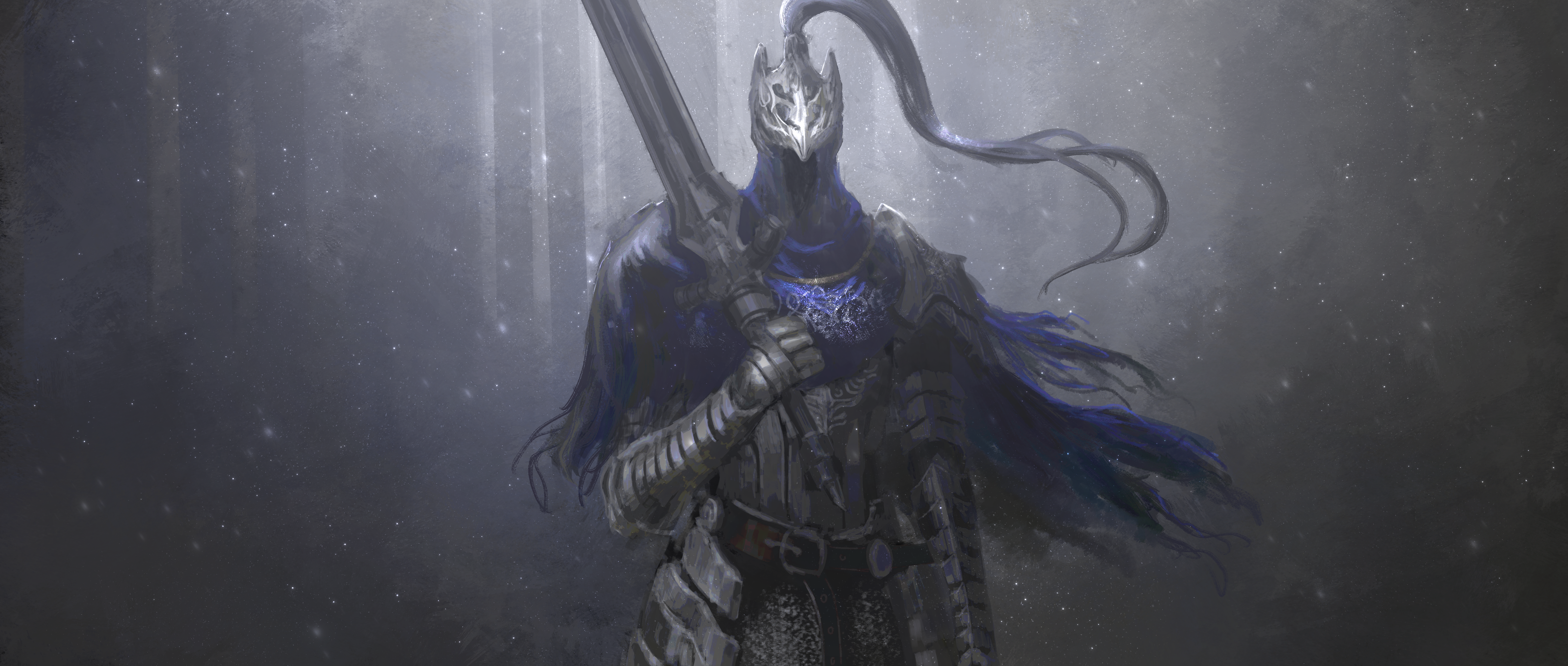 1boy absurdres armor artorias_the_abysswalker asaki_(asaki_vision) breastplate cape dark_souls_(series) dark_souls_i full_armor gauntlets greatsword helm helmet highres holding holding_sword holding_weapon knight male_focus over_shoulder pauldrons plume shoulder_armor solo standing sword torn_cape torn_clothes weapon