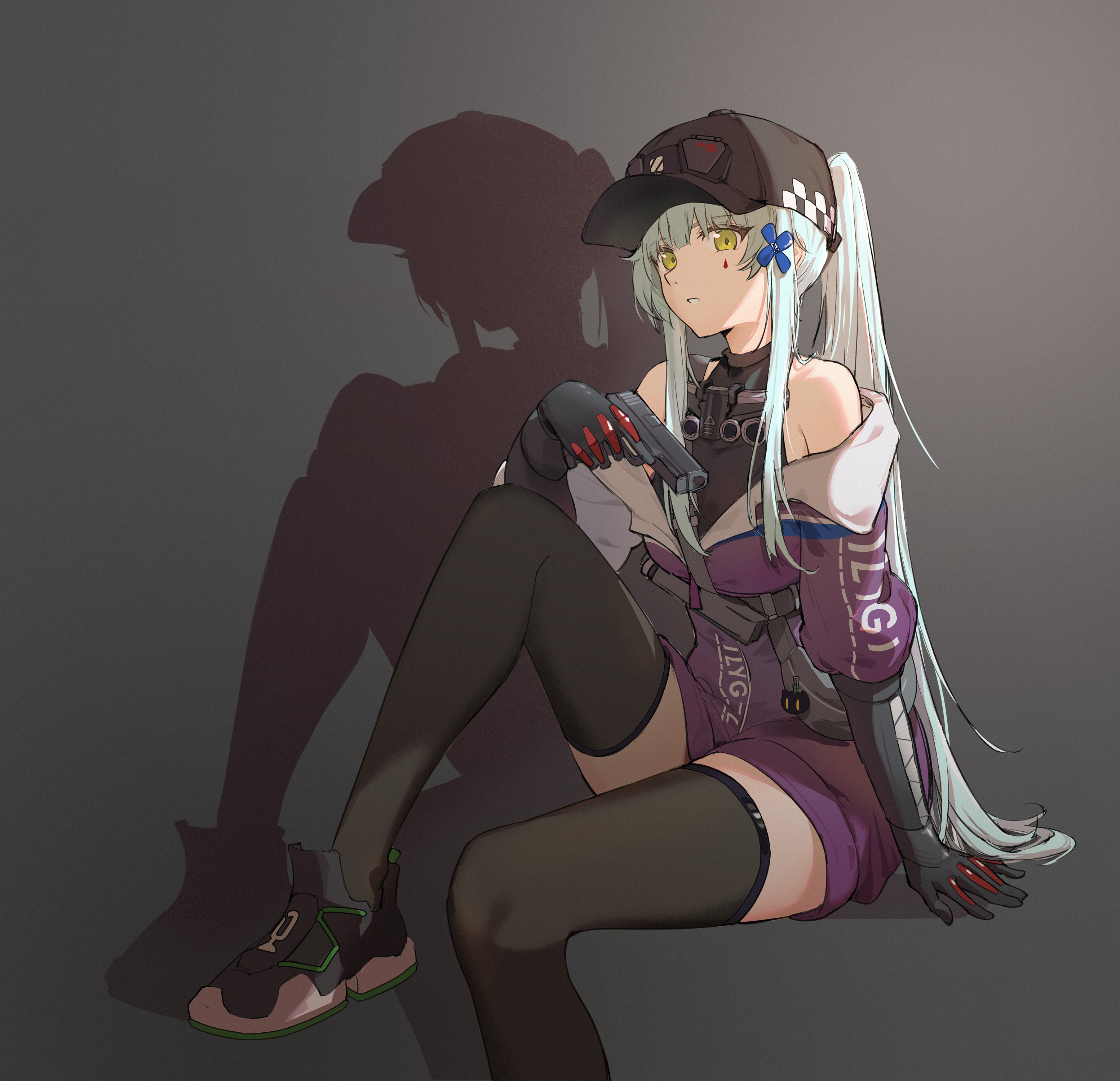 absurdres bare_shoulders black_gloves black_thighhighs blue_hair cape girls'_frontline girls'_frontline_2:_exilium gloves green_eyes gun handgun highres hk416_(girls'_frontline) jacket jishou_kusaboukun klukai_(girls'_frontline_2) shoes skindentation sneakers thighhighs weapon white_hair zettai_ryouiki