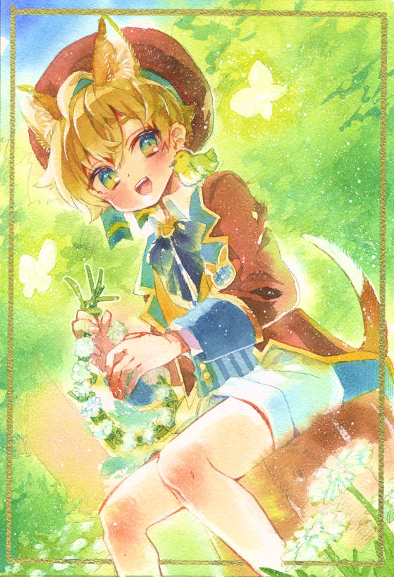 1boy 211592 :d ahoge animal_ears bird blonde_hair blue_eyes blush bug butterfly child collared_shirt diagonal-striped_clothes dog_ears dog_tail dutch_angle extra_ears feet_out_of_frame fingernails flower foliage forest green_bird hair_between_eyes hat head_wreath insect inset_border kemonomimi_mode knee_blush lapels light_particles looking_at_animal luke_(obey_me!) male_focus multicolored_eyes nature neck_ribbon notched_lapels obey_me!:_one_master_to_rule_them_all! open_mouth painting_(medium) ribbon sailor_hat shirt short_hair shorts sitting sleeve_cuffs smile solo striped_clothes tail tailcoat traditional_media tree tree_stump two-sided_fabric two-tone_eyes vest waistcoat watercolor_(medium) white_shorts yellow_eyes