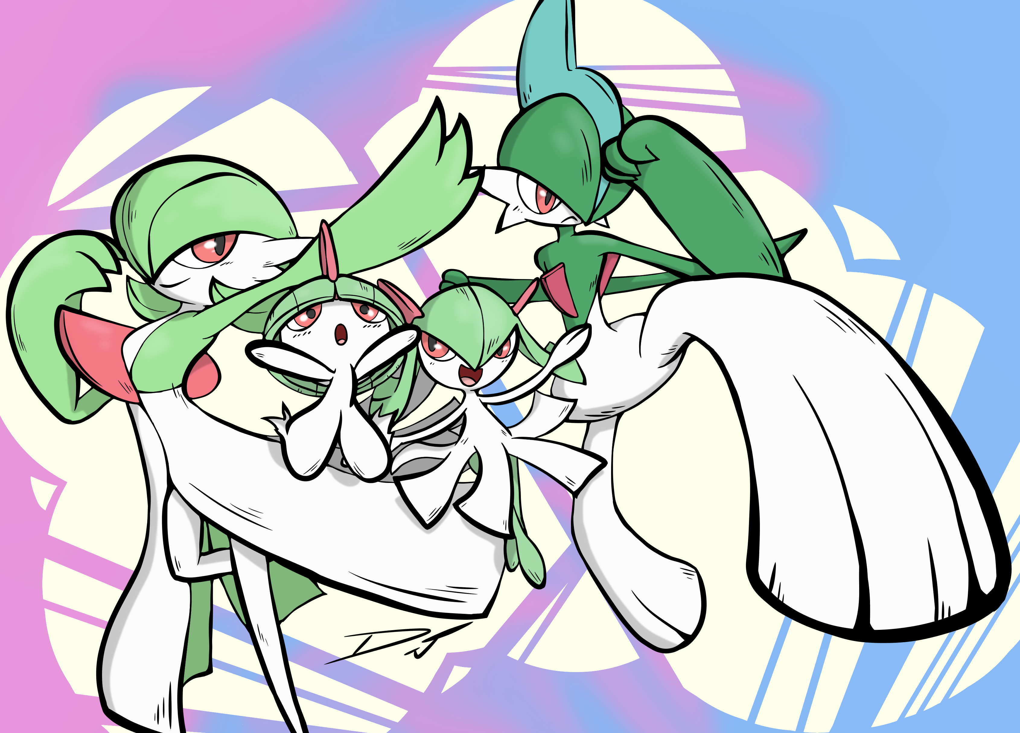 absurdres bob_cut bowl_cut colored_skin dress evolutionary_line gallade gardevoir gen_3_pokemon gen_4_pokemon green_hair green_skin hair_over_one_eye highres horns inkbooba kirlia multicolored_skin nintendo pink_eyes pokemon pokemon_(creature) ralts sidelocks signature smile two-tone_skin white_dress white_skin