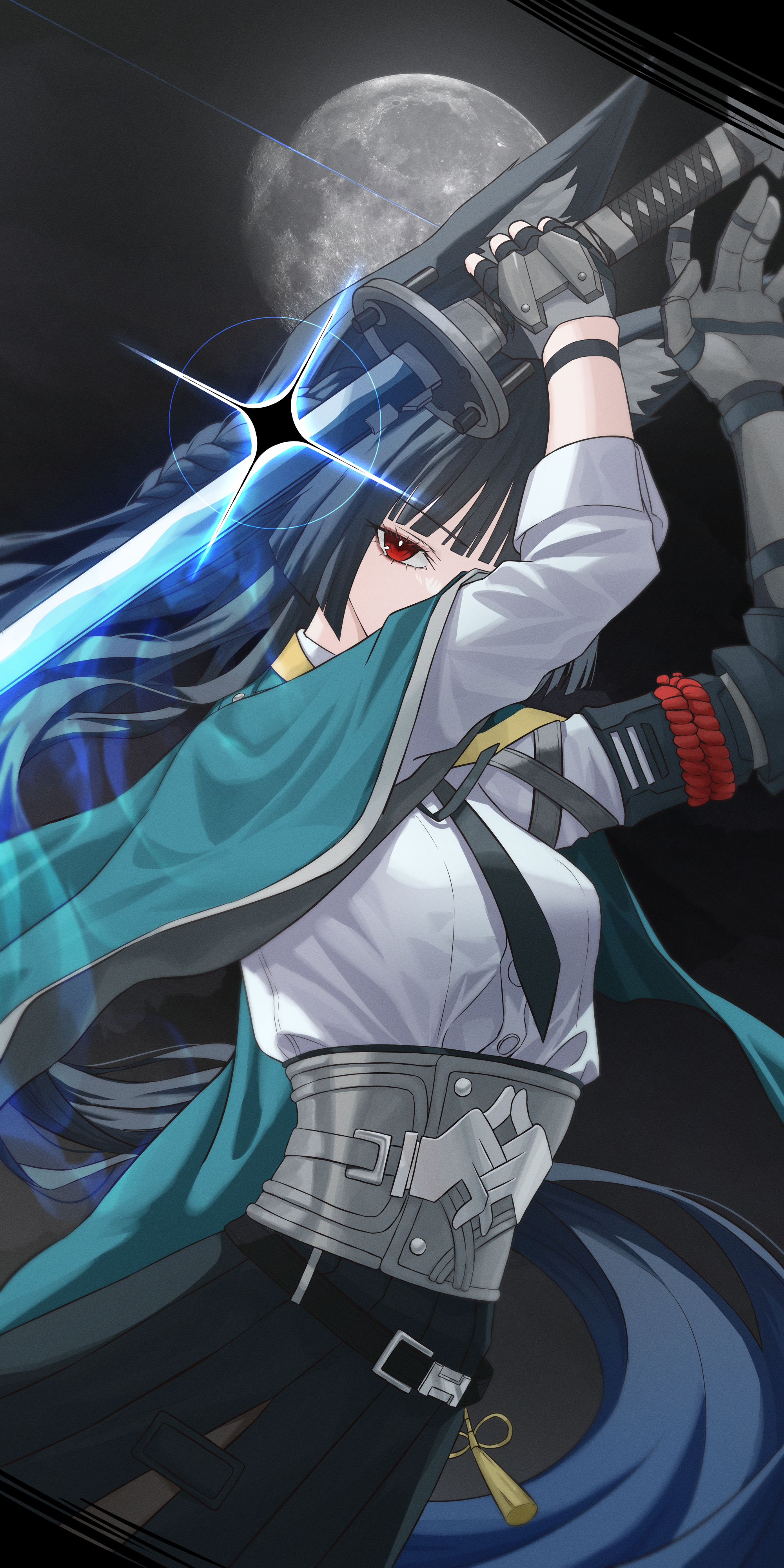 1girl absurdres animal_ears arms_up black_hair breasts commentary cowboy_shot fighting_stance fingerless_gloves full_moon gauntlets gloves green_necktie hayron highres holding holding_sword holding_weapon hoshimi_miyabi long_hair looking_at_viewer medium_breasts moon necktie red_eyes shirt solo sword very_long_hair weapon white_shirt zenless_zone_zero