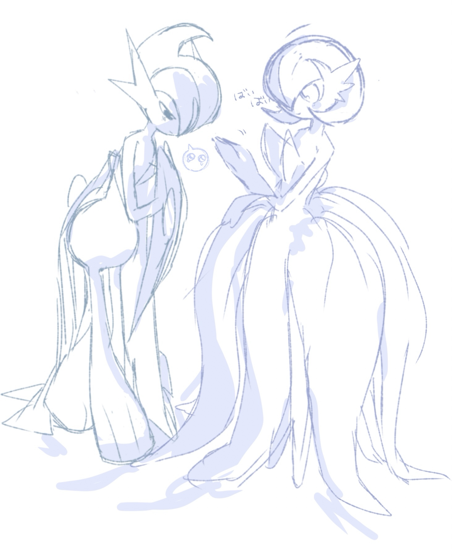 arm_blade bob_cut cow_gv dress gallade gardevoir gen_3_pokemon gen_4_pokemon hair_over_one_eye highres mega_gallade mega_gardevoir mega_pokemon nintendo pokemon pokemon_(creature) simple_background sketch weapon white_background white_dress