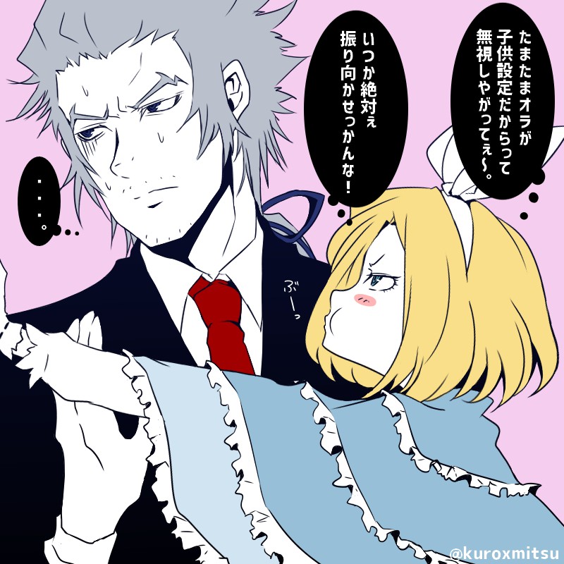 1boy 1girl age_difference annoyed blonde_hair blowing blue_eyes blue_ribbon blush_stickers capelet classicaloid eyelashes facial_hair frilled_capelet frills goatee_stubble hairband johann_sebastian_bach_(classicaloid) kuroxmitsu_kinako mustache_stubble necktie partially_colored pink_background pout pyotr_illyich_tchaikovsky_(classicaloid) red_necktie ribbon short_hair speech_bubble stubble thought_bubble translation_request white_hairband