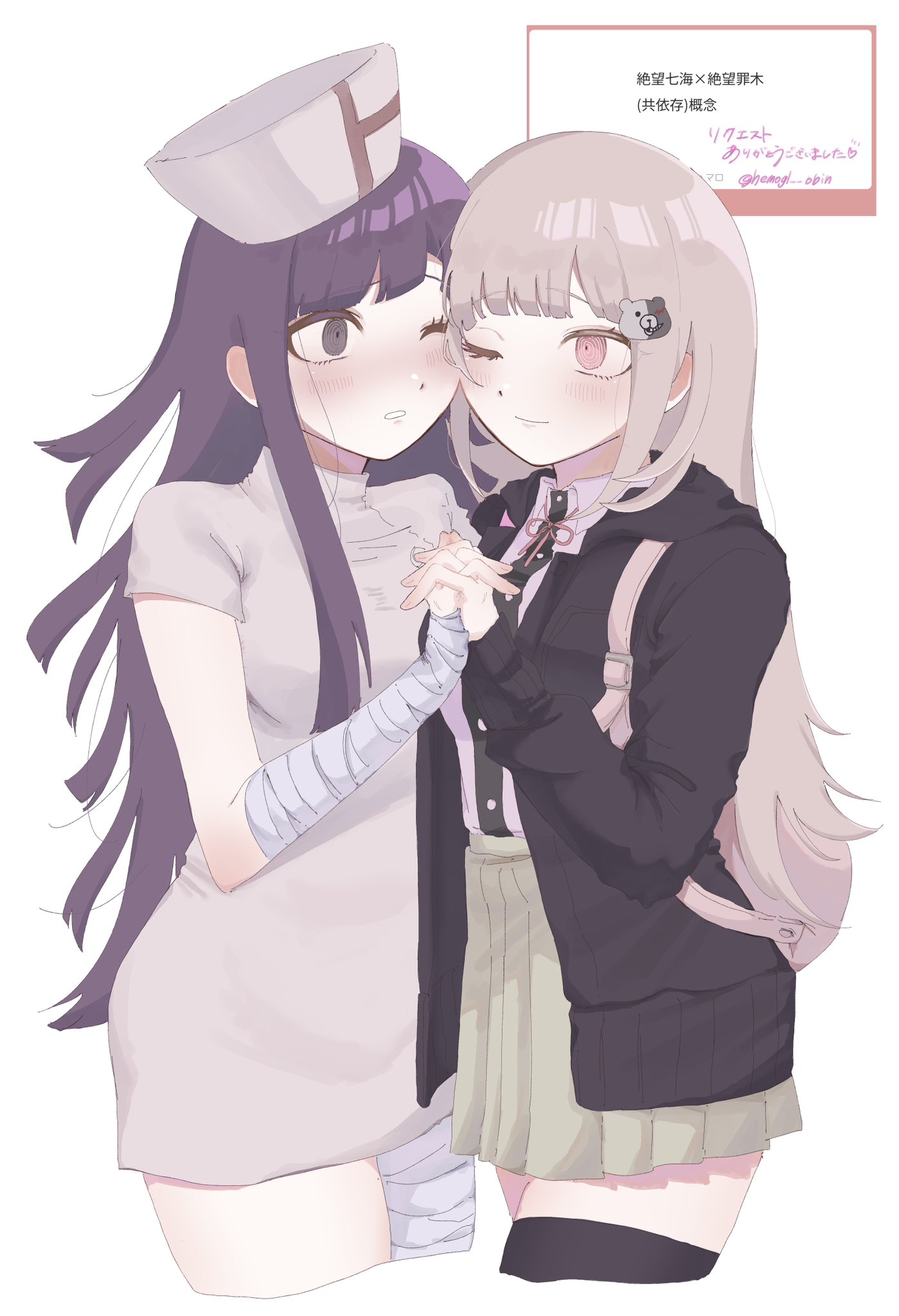 2girls ;) alternate_hair_length alternate_hairstyle bandaged_arm bandages black_hair black_jacket black_shirt black_thighhighs blush breasts brown_hair brown_skirt cropped_legs danganronpa_(series) danganronpa_2:_goodbye_despair dress_shirt highres holding_hands jacket konaien_(hemogl_obin) large_breasts long_hair long_sleeves miniskirt monokuma multiple_girls nanami_chiaki neck_ribbon nurse official_alternate_costume one_eye_closed open_clothes open_jacket pink_bag pink_eyes pink_ribbon pleated_skirt ribbon shirt skirt smile thighhighs translation_request tsumiki_mikan white_shirt zettai_ryouiki