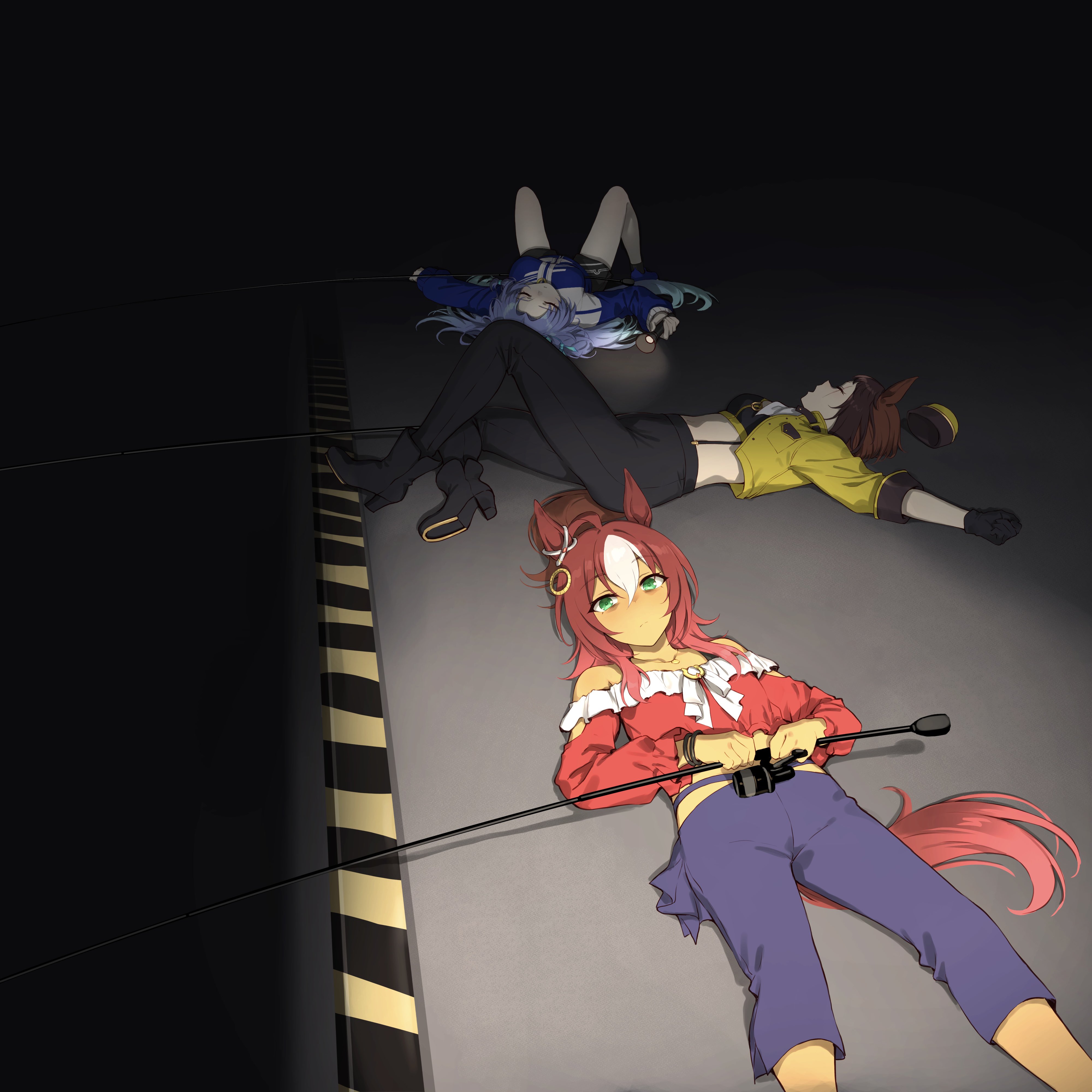 3girls absurdres ahoge animal_ears black_pants blue_jacket brown_hair byerley_turk_(umamusume) commentary_request commission cropped_jacket dark-skinned_female dark_skin darley_arabian_(umamusume) derivative_work ear_covers ear_ornament fishing_rod flashlight garrison_cap godolphin_barb_(umamusume) green_eyes hat highres holding holding_fishing_rod holding_flashlight horse_ears horse_girl jacket long_hair long_sleeves looking_at_viewer lying military_jacket motsunabe_(mo2nap3) multiple_girls on_back pants parody red_shirt screenshot_redraw shirt skeb_commission smile suiyou_dou_de_shou track_jacket umamusume unworn_hat unworn_headwear white_hair yellow_hat yellow_jacket