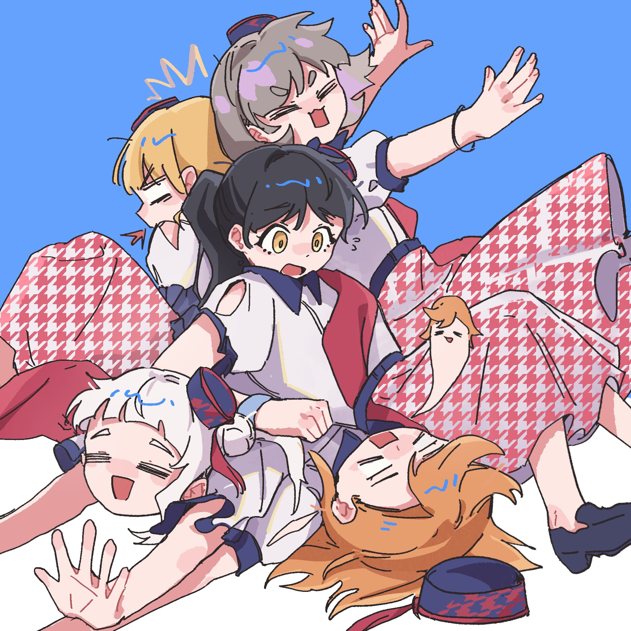 5girls :3 :d ^^^ arashi_chisato arched_bangs black_hair black_shoes blank_eyes blonde_hair blue_background blue_hat bob_cut closed_eyes commentary double_bun english_commentary flying_sweatdrops giving_up_the_ghost grey_hair hair_bun hat hazuki_ren heanna_sumire highres kawa_(chuan_kawa_) liella!_first_generation long_hair love_live! love_live!_superstar!! lying lying_on_person multiple_girls on_stomach open_mouth orange_hair ponytail puffy_short_sleeves puffy_sleeves shibuya_kanon shirt shoes short_eyebrows short_hair short_sleeves simple_background sitting sitting_on_person smile start!!_true_dreams_(love_live!) tang_keke thick_eyebrows twintails unworn_hat unworn_headwear v-shaped_eyebrows white_hair white_shirt yellow_eyes