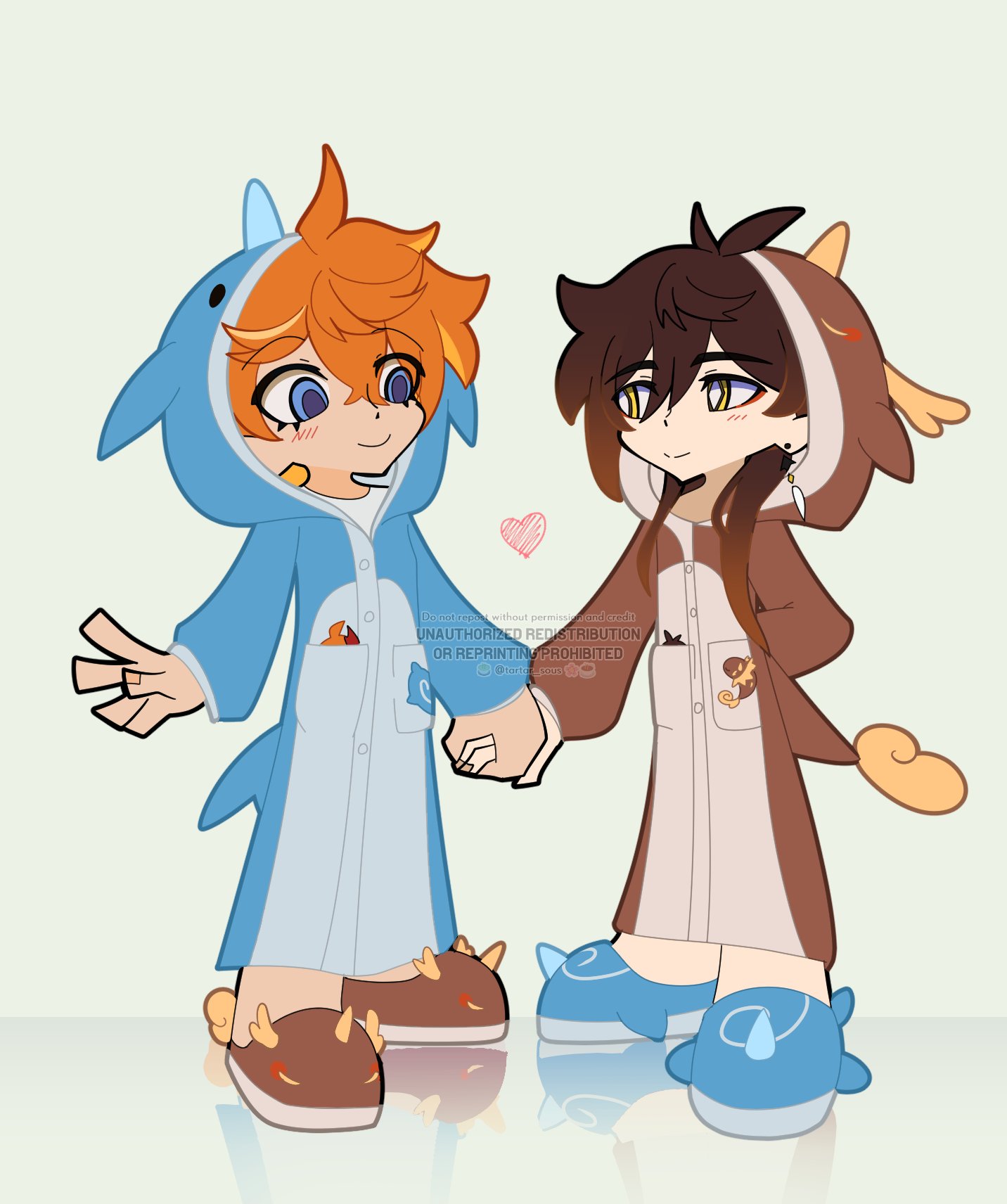 2boys alternate_costume blush genshin_impact highres holding_hands multiple_boys onesie pajamas slippers tartaglia_(genshin_impact) tartar_sous tumblr yaoi zhongli_(genshin_impact)