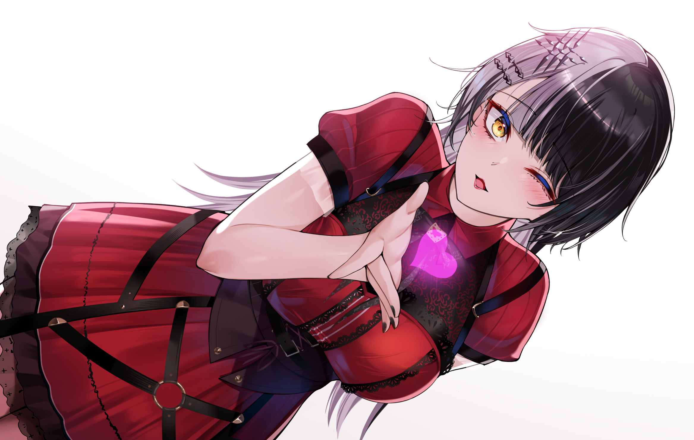 1girl black_corset black_hair black_nails blowing_kiss blush breasts corset cowboy_shot dress dutch_angle fingernails grey_hair hair_ornament hand_up heart highres hololive hololive_english large_breasts long_fingernails long_hair long_sleeves looking_at_viewer misa_pika multicolored_hair nail_polish official_alternate_costume one_eye_closed parted_lips puffy_short_sleeves puffy_sleeves red_dress shiori_novella shiori_novella_(casual) short_sleeves simple_background solo split-color_hair standing two-tone_hair virtual_youtuber white_background yellow_eyes
