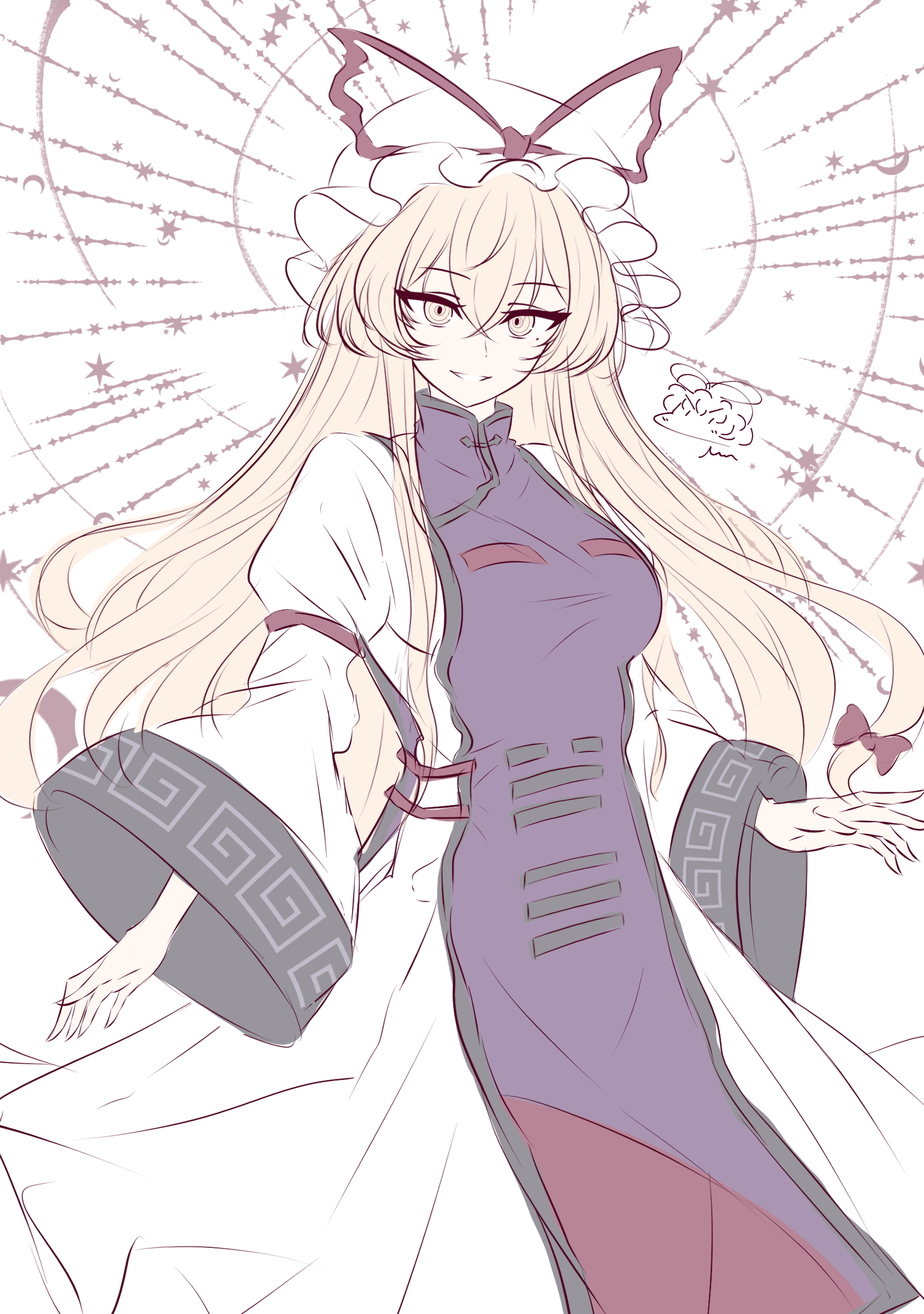 1girl absurdres blonde_hair breasts dress hair_between_eyes hair_ribbon hat highres large_breasts long_hair long_sleeves looking_at_viewer mob_cap mole mole_under_eye partially_colored puffy_sleeves purple_tabard ribbon rinkaito1231 signature sketch smile solo tabard teeth touhou very_long_hair white_dress yakumo_yukari yellow_eyes