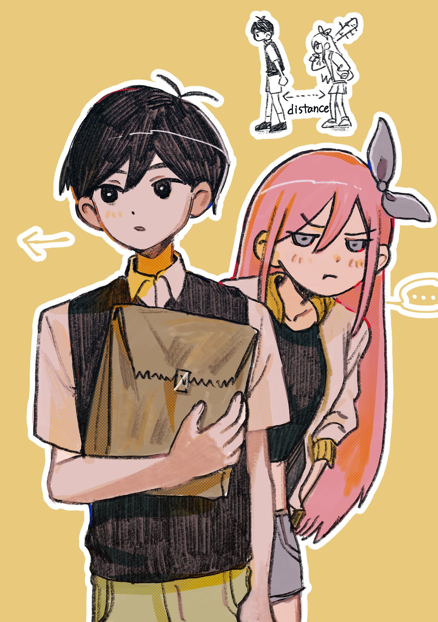 ... 1boy 1girl antenna_hair arrow_(symbol) aubrey_(faraway)_(omori) aubrey_(omori) bag black_eyes black_hair black_sweater_vest blue_eyes blue_hairband blue_skirt bright_pupils brown_shorts closed_mouth collared_shirt crop_top denim denim_skirt hairband highres holding holding_bag jacket long_hair long_sleeves omori paper_bag parted_lips pink_hair pout shirt short_hair short_sleeves shorts simple_background skirt speech_bubble spoken_ellipsis sunny_(omori) sweater_vest wanosaku white_jacket white_pupils white_shirt yellow_background