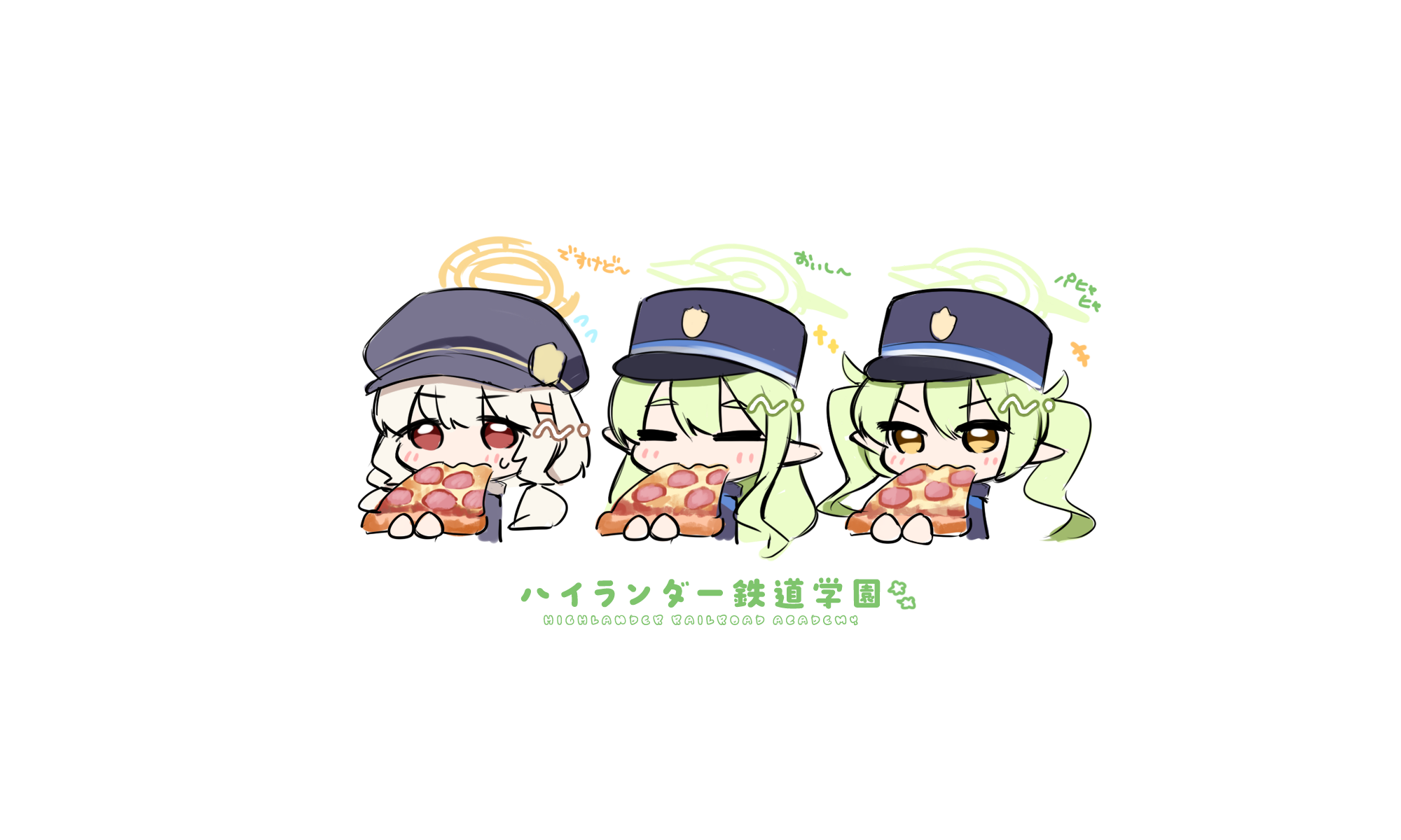 3girls aoba_(blue_archive) black_hat blue_archive blue_hat blue_jacket blush brown_eyes newsboy_cap chibi closed_eyes commentary_request cropped_torso eating flying_sweatdrops food green_hair grey_hair halo hat highres hikari_(blue_archive) holding holding_food hoshimiya_aki jacket long_hair multiple_girls nozomi_(blue_archive) pizza pizza_slice pointy_ears red_eyes shako_cap siblings simple_background sisters small_sweatdrop sparkle sweat translation_request twins twintails upper_body v-shaped_eyebrows very_long_hair white_background