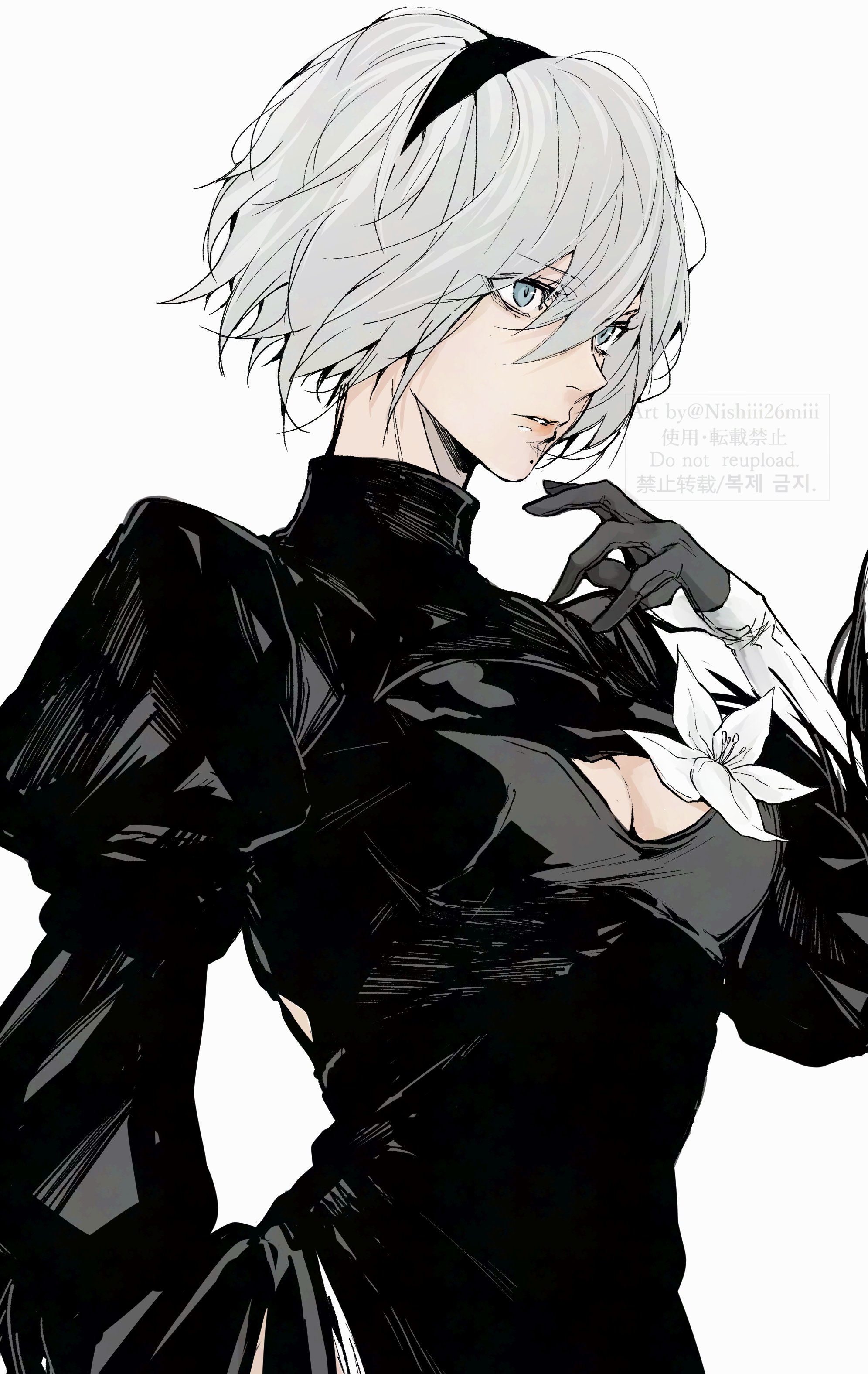 1girl 2b_(nier:automata) absurdres android blue_eyes breasts cleavage flower flower_on_chest hand_up headband highres looking_at_another lunar_tear nier:automata nier_(series) nishiii26miii short_hair simple_background small_breasts solo white_background white_hair