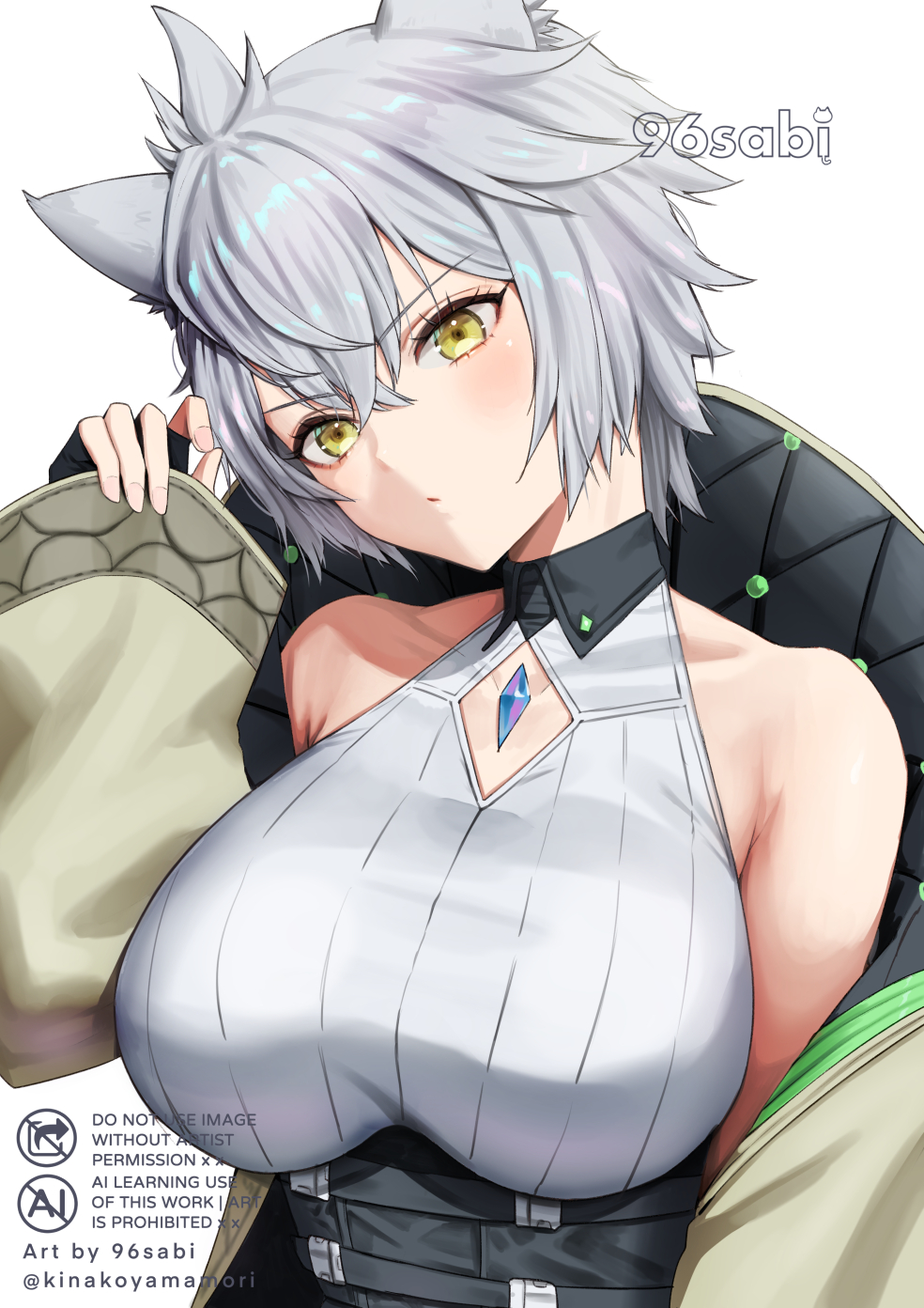 1girl animal_ear_fluff animal_ears fingerless_gloves gloves grey_hair highres looking_at_viewer na'el_(xenoblade) short_hair simple_background solo upper_body white_background xenoblade_chronicles_(series) xenoblade_chronicles_3 xenoblade_chronicles_3:_future_redeemed yamamori_kinako yellow_eyes