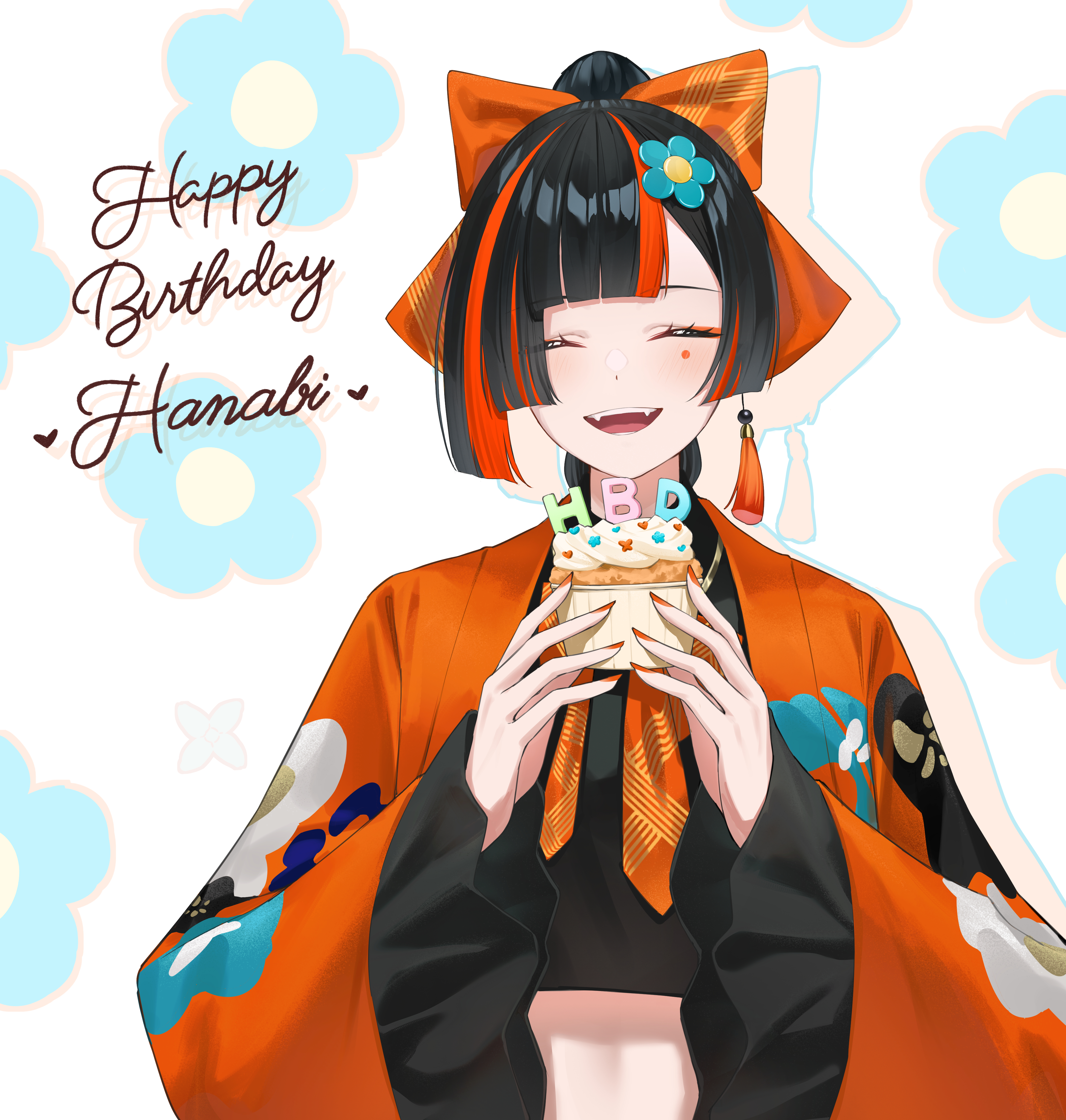 1girl absurdres black_hair blush bokuhakiyoshi bow cake choya_hanabi choya_hanabi_(1st_costume) closed_eyes colored_shadow cupcake drop_shadow earrings facial_mark fangs flower food hair_bow hair_flower hair_ornament happy_birthday highres holding holding_cake holding_food japanese_clothes jewelry looking_at_viewer multicolored_hair open_mouth orange_bow orange_hair orange_nails shadow single_earring solo streaked_hair teeth two-tone_hair virtual_youtuber vspo!