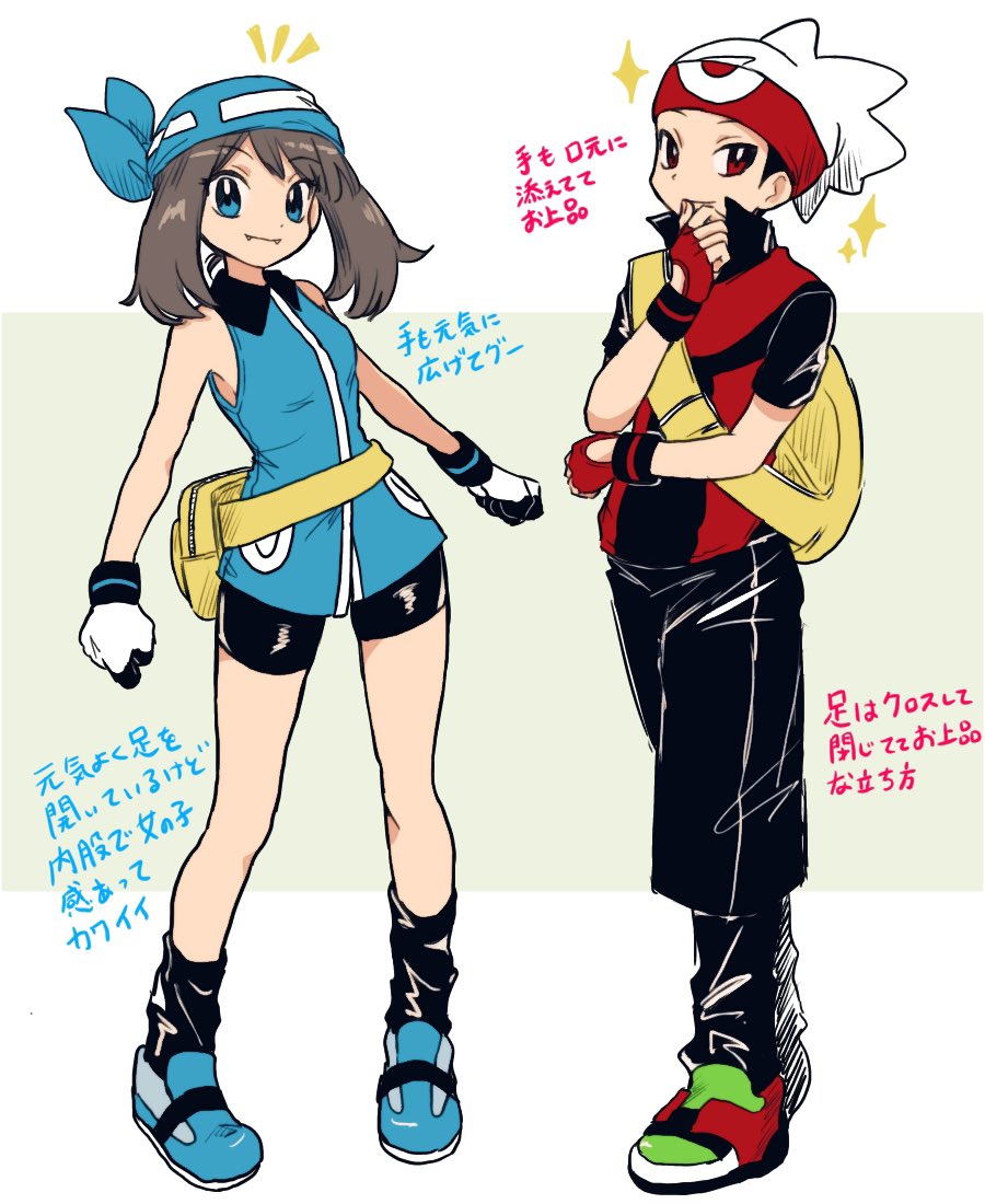1boy 1girl bag bandana beanie bike_shorts black_pants black_socks blue_bandana blue_eyes blue_shirt blue_shoes brendan_(pokemon) brown_hair fangs full_body gloves green_shoes hat looking_at_viewer may_(pokemon) nintendo pants pokemon pokemon_adventures red_eyes red_gloves red_shirt shirt shoes short_hair simple_background sleeveless smile socks standing white_background white_gloves yellow_bag yukue_m