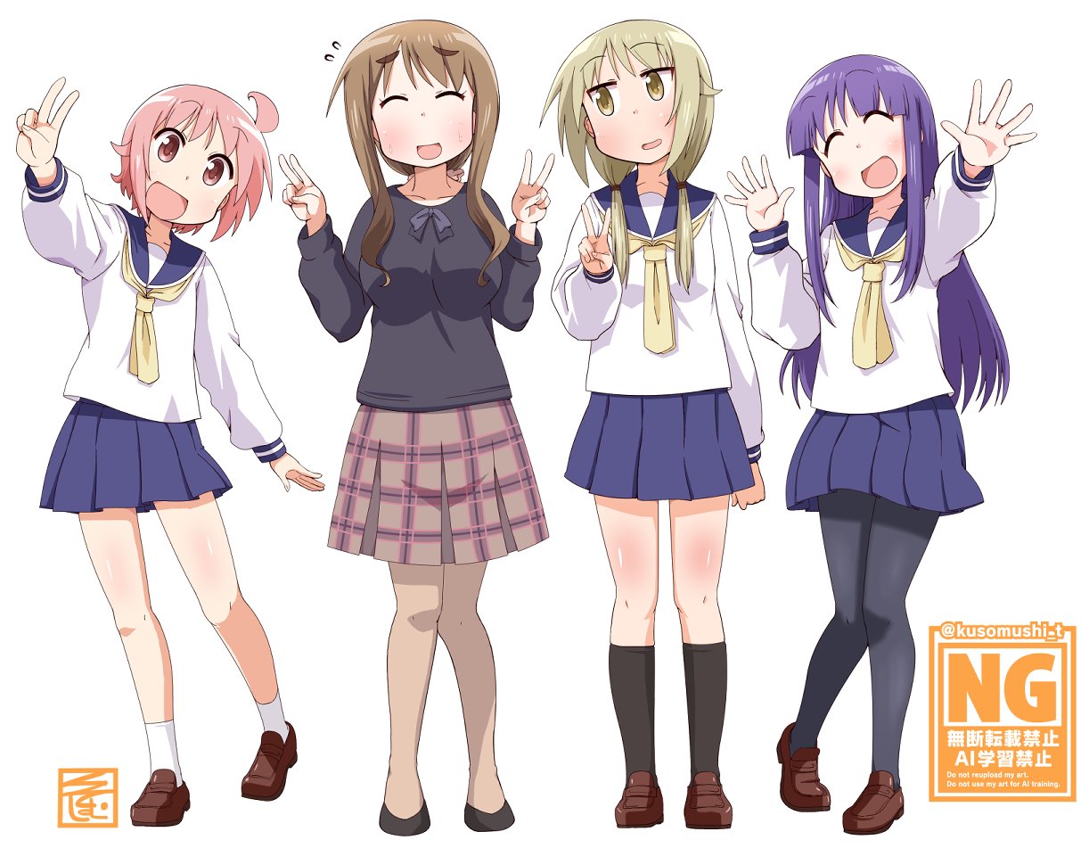 4girls ahoge aikawa_chiho blonde_hair blush breasts brown_hair closed_eyes flat_chest hinata_yukari ichii_yui ki_(adotadot) kneehighs large_breasts long_hair multiple_girls nonohara_yuzuko pantyhose pink_eyes pink_hair purple_hair school_uniform short_hair sidelocks skirt small_breasts socks sweater twintails v white_background yellow_eyes yuyushiki