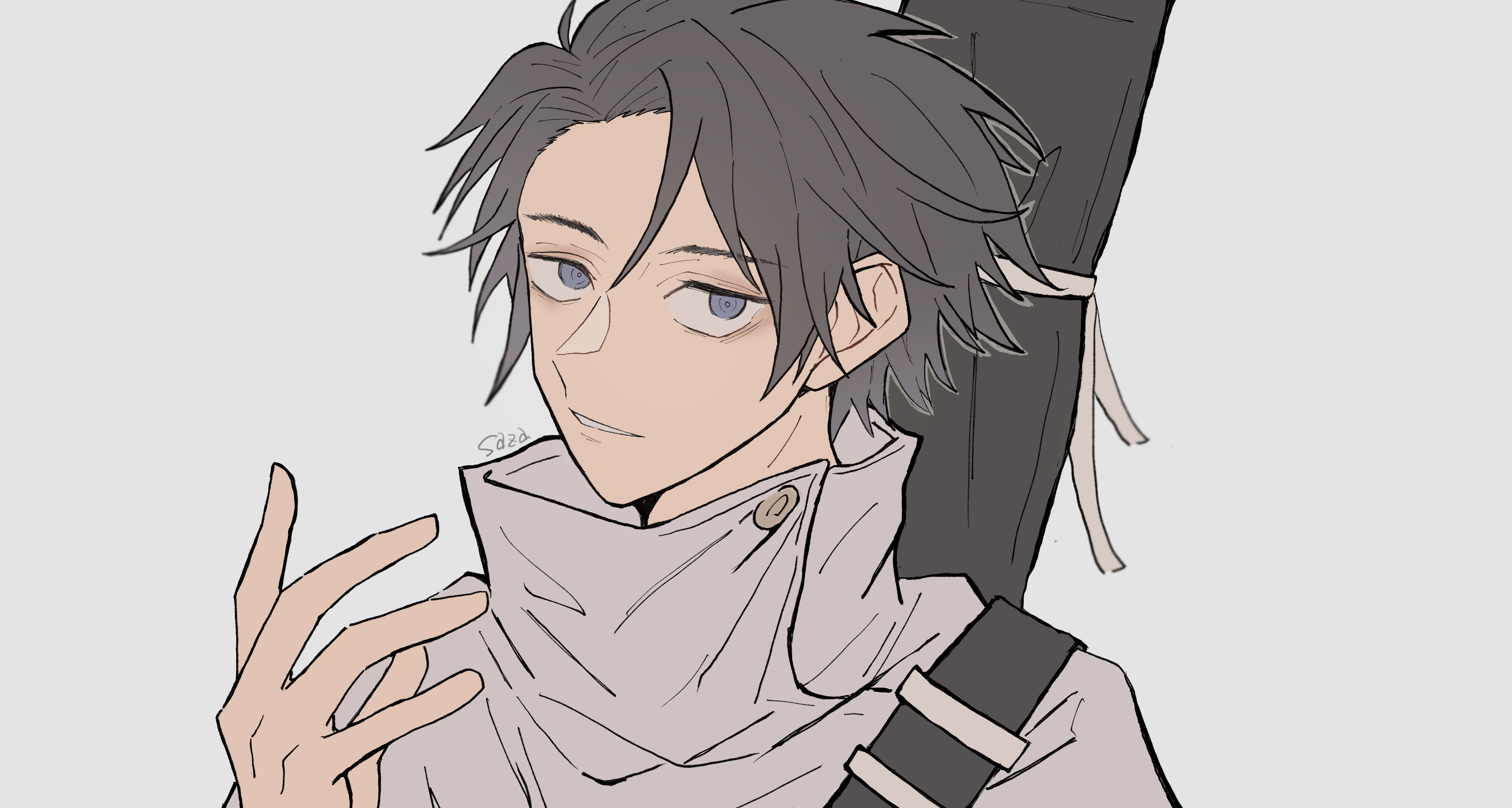 1boy absurdres arm_up black_hair blue_eyes collared_jacket commentary_request curtained_hair grey_background hair_behind_ear high_collar highres jacket jujutsu_kaisen looking_to_the_side male_focus okkotsu_yuta parted_lips popped_collar short_hair sideways_glance simple_background smile solo upper_body waku-mika weapon weapon_on_back white_jacket