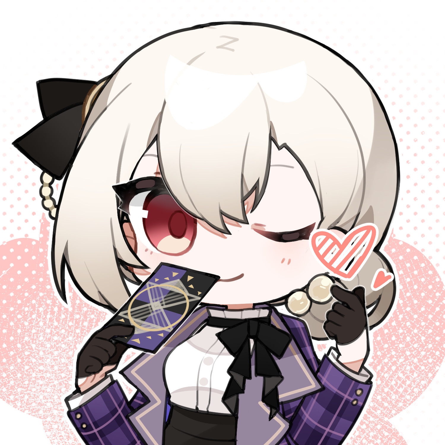 1girl artist_request black_gloves black_ribbon blonde_hair blue_jacket card chibi chibi_only chinese_commentary covering_own_mouth finger_heart girls'_frontline girls'_frontline_neural_cloud gloves highres jacket looking_at_viewer official_art one_eye_closed red_eyes ribbon rmb-93_(girls'_frontline) second-party_source smile solo sticker_(medium) tarot tarot_card yelena_(neural_cloud)
