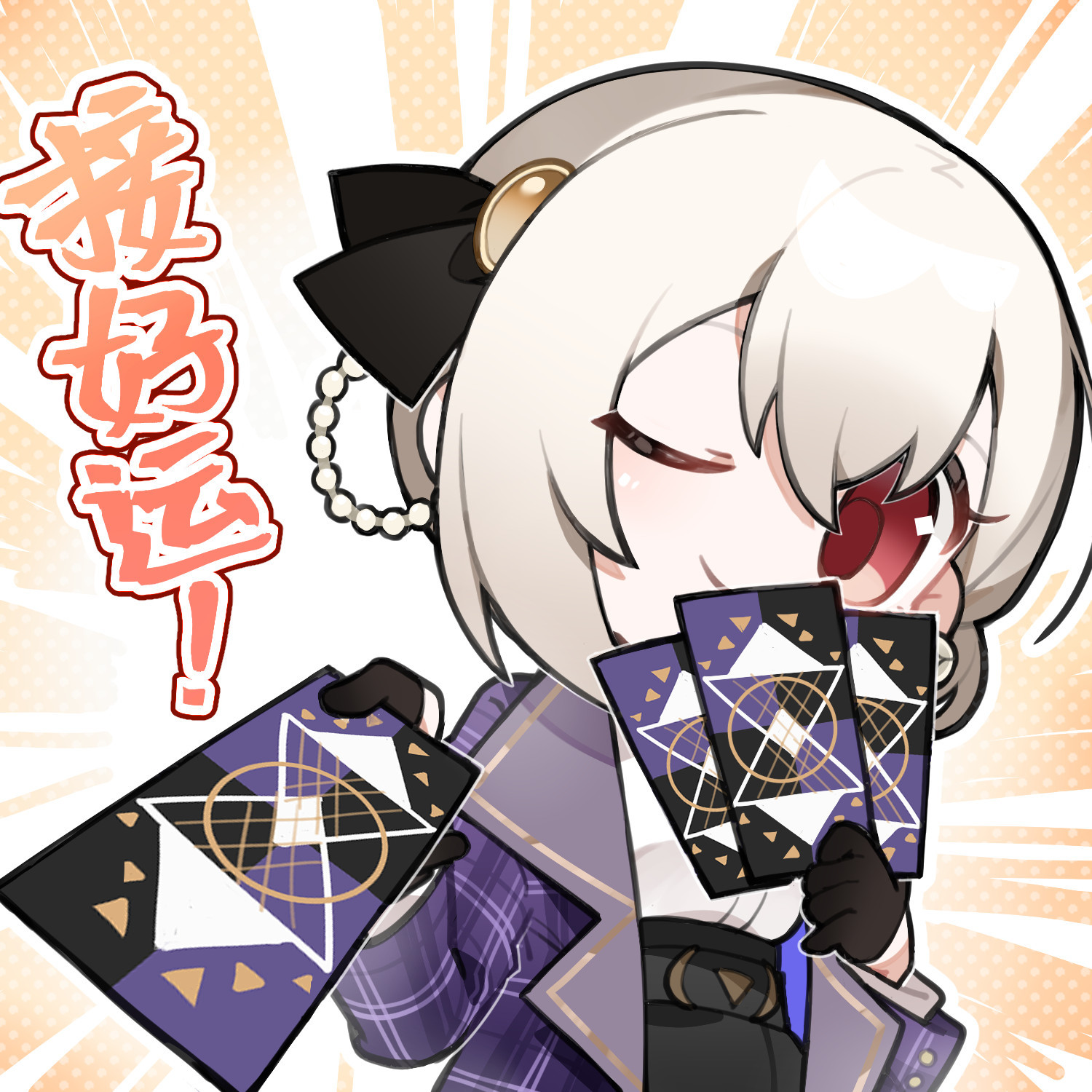 1girl artist_request black_gloves black_ribbon blonde_hair blue_jacket card chibi chibi_only chinese_commentary chinese_text covering_own_mouth girls'_frontline girls'_frontline_neural_cloud gloves highres holding holding_card jacket looking_at_viewer official_art one_eye_closed red_eyes ribbon rmb-93_(girls'_frontline) second-party_source smile solo sticker_(medium) tarot tarot_card yelena_(neural_cloud)