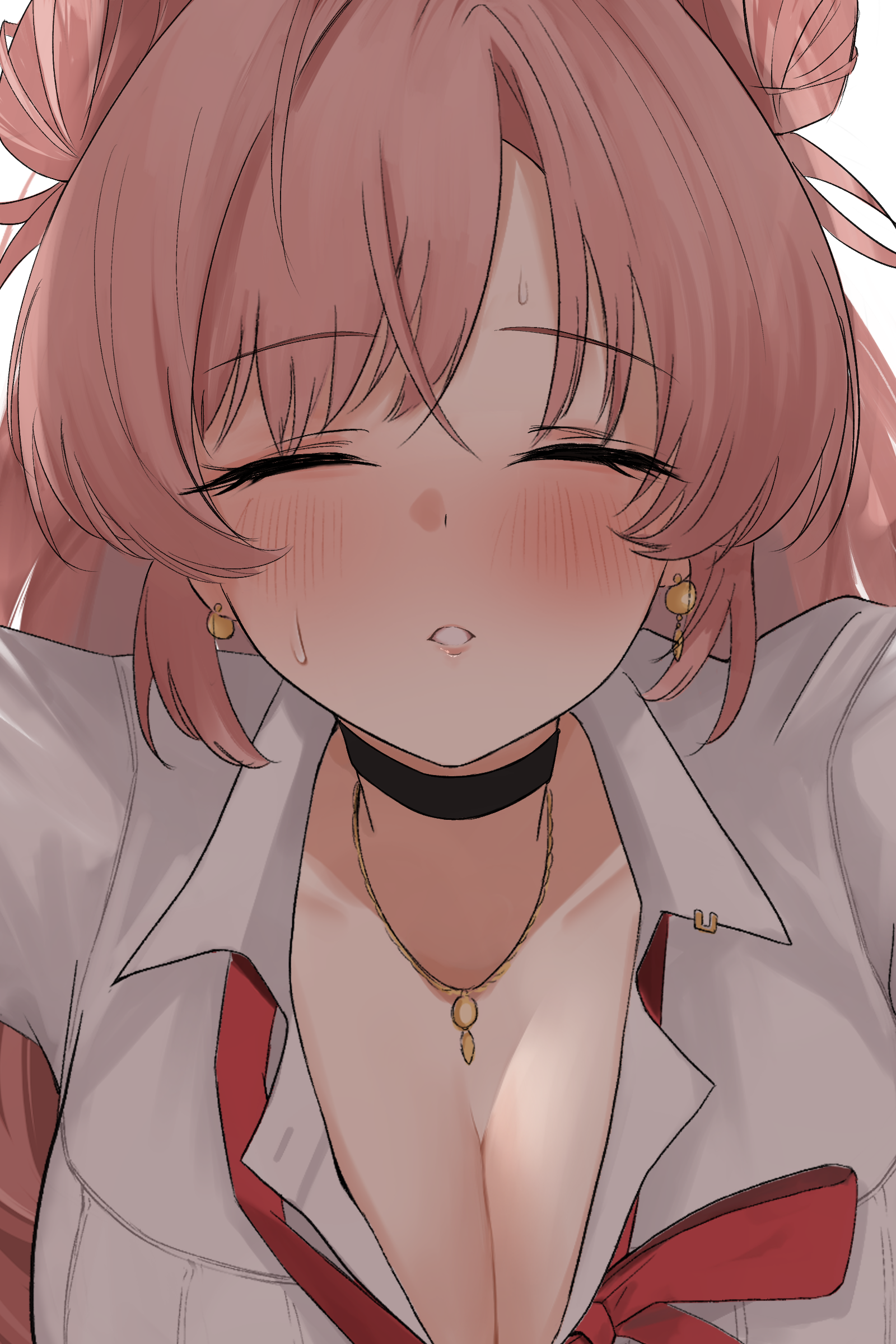 1boy 1girl 4jiri absurdres black_choker black_skirt blue_archive blush breasts choker cleavage closed_eyes commentary_request double_bun fake_horns fang hair_bun hairband halo highres horn_hairband horns implied_kiss jewelry kirara_(blue_archive) large_breasts long_hair looking_at_viewer loose_neck_ribbon neck_ribbon necklace open_collar partial_commentary partially_unbuttoned pink_eyes pink_hair pov ribbon shirt skirt standing thigh_strap white_shirt