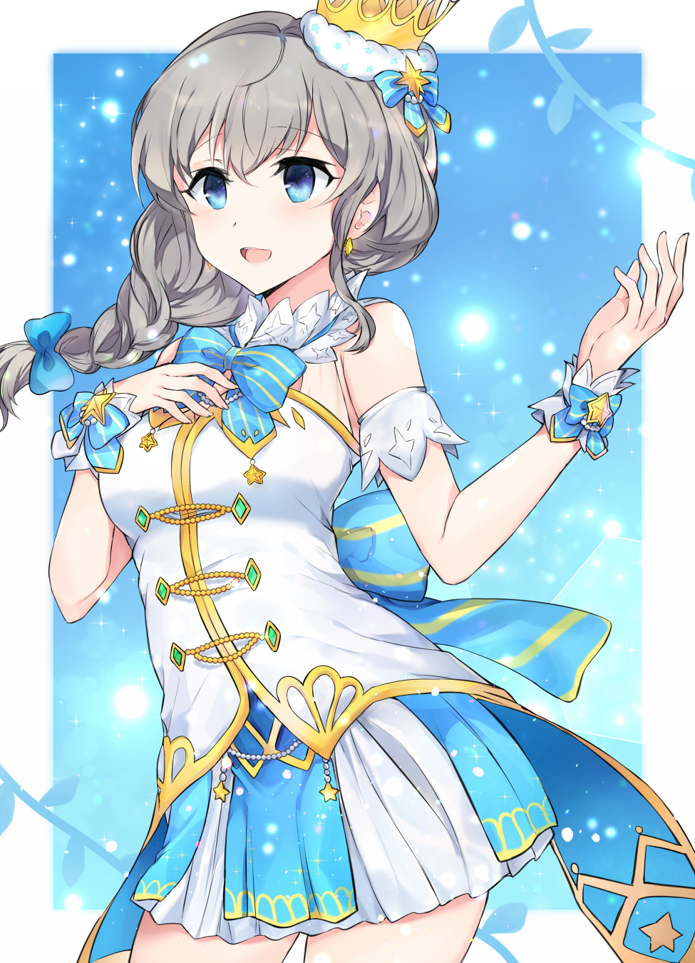 1girl 5p_(opi_32) battle_girl_high_school blue_bow blue_eyes border bow braid cowboy_shot crown earrings eyelashes highres jewelry looking_ahead narumi_haruka open_mouth shirt solo striped_bow white_border white_shirt wrist_cuffs
