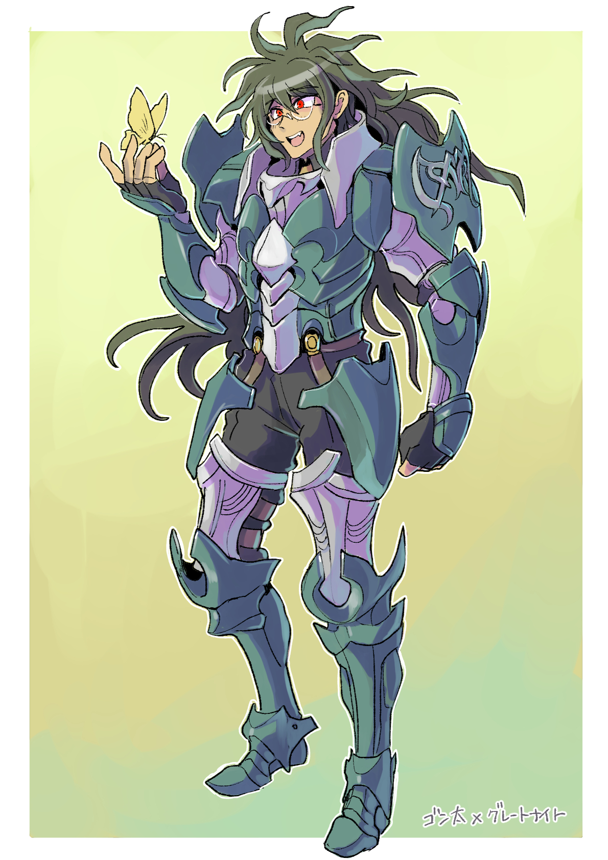 1boy arm_at_side armor border bug butterfly butterfly_on_hand cosplay cosplay_request danganronpa_(series) danganronpa_v3:_killing_harmony fang fire_emblem fire_emblem_awakening frederick_(fire_emblem) frederick_(fire_emblem)_(cosplay) full_body glasses gokuhara_gonta green_hair hair_between_eyes highres insect kumakoro_(tetsupag) long_hair male_focus messy_hair nintendo simple_background very_long_hair white_border yellow_butterfly