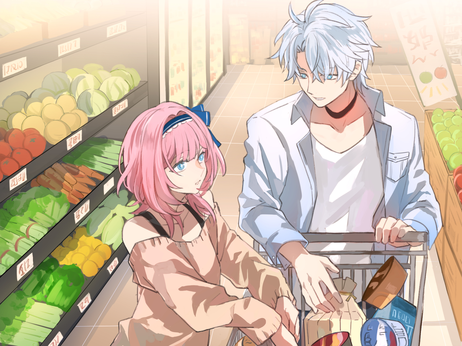 1boy 1girl antenna_hair black_choker blue_eyes blue_hairband brown_sweater carrot choker convenience_store cyrene_(philia093)_(honkai:_star_rail) cyrene_(honkai:_star_rail) food groceries hairband highres honkai:_star_rail honkai_(series) indoors jacket kk_(kkgame7733) looking_at_another medium_hair phainon_(honkai:_star_rail) pink_hair shirt shop shopping_cart short_hair sweater tile_floor tiles tomato vegetable white_hair white_jacket white_shirt