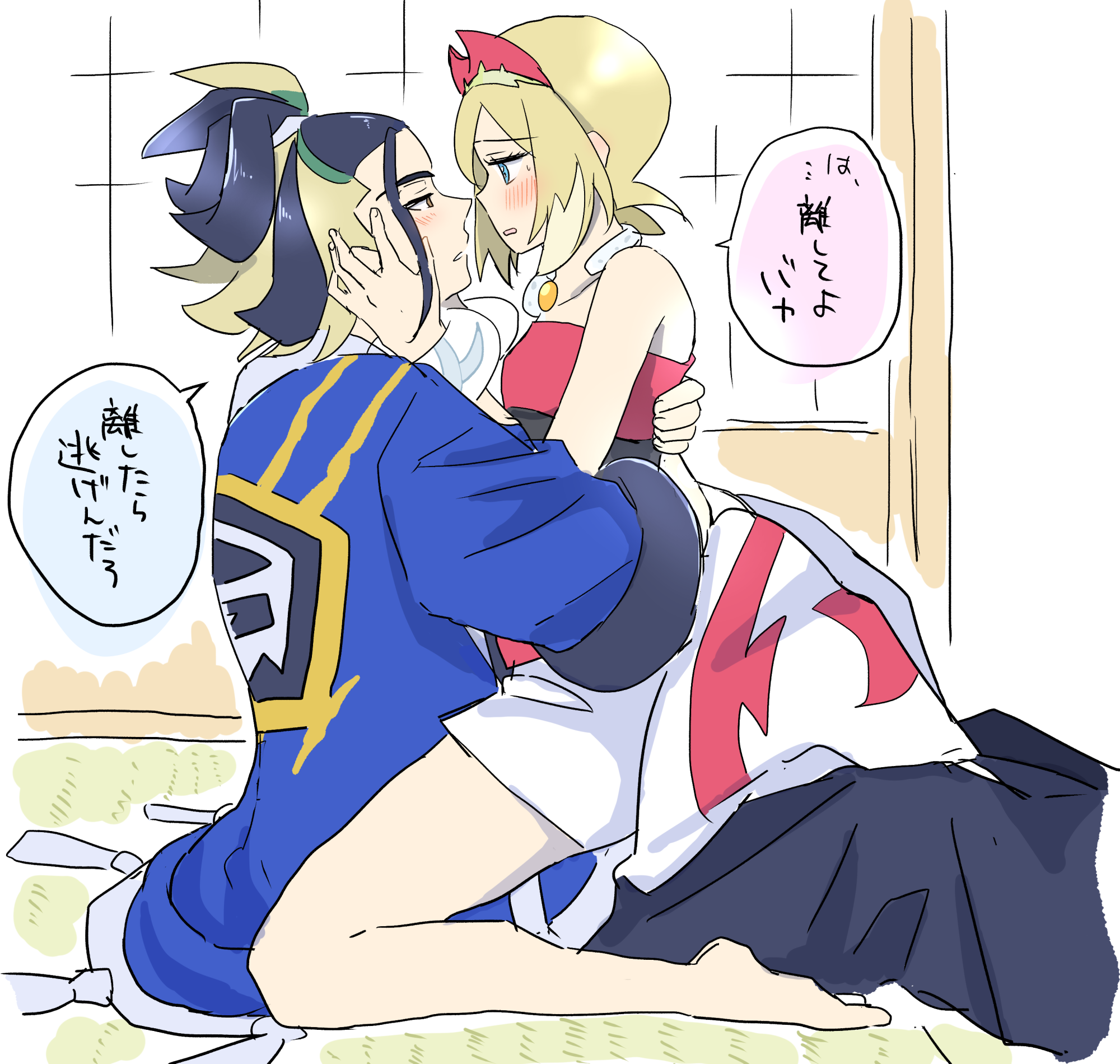 1boy 1girl adaman_(pokemon) blonde_hair blue_coat blue_eyes blush coat face-to-face from_side hetero highres hug imminent_kiss irida_(pokemon) kazune_(kazukana09) looking_at_another multicolored_hair nintendo pokemon pokemon_legends:_arceus translation_request two-tone_hair