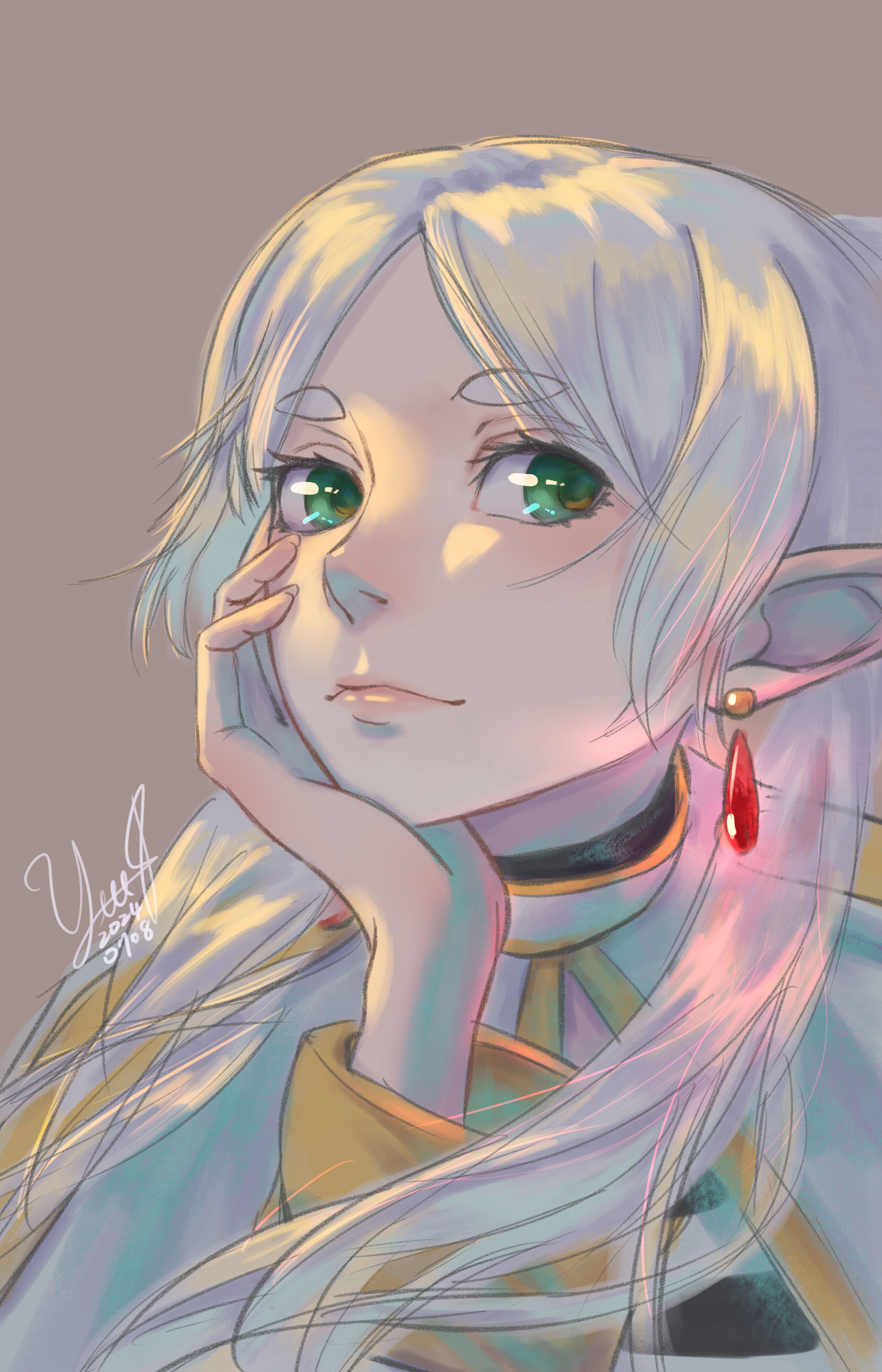 1girl absurdres chinese_commentary closed_mouth commentary_request dated earrings elf floating_earrings frieren glowing glowing_earrings green_eyes grey_background hand_on_own_face highres jewelry long_hair looking_at_viewer parted_bangs pink_lips pointy_ears signature simple_background smile solo sousou_no_frieren teardrop_earrings thick_eyebrows upper_body white_hair yeeej