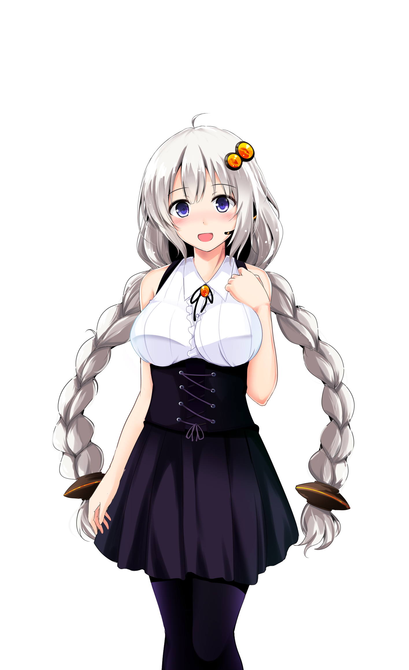 1girl ahoge alpha_transparency black_corset black_pantyhose black_skirt blue_eyes braid breasts commentary_request corset cowboy_shot grey_hair hair_ornament headset high-waist_skirt highres kiki_(koikuchikinako) kizuna_akari large_breasts low_twin_braids miniskirt pantyhose psd_available shirt skirt sleeveless sleeveless_shirt solo transparent_background twin_braids voiceroid white_shirt