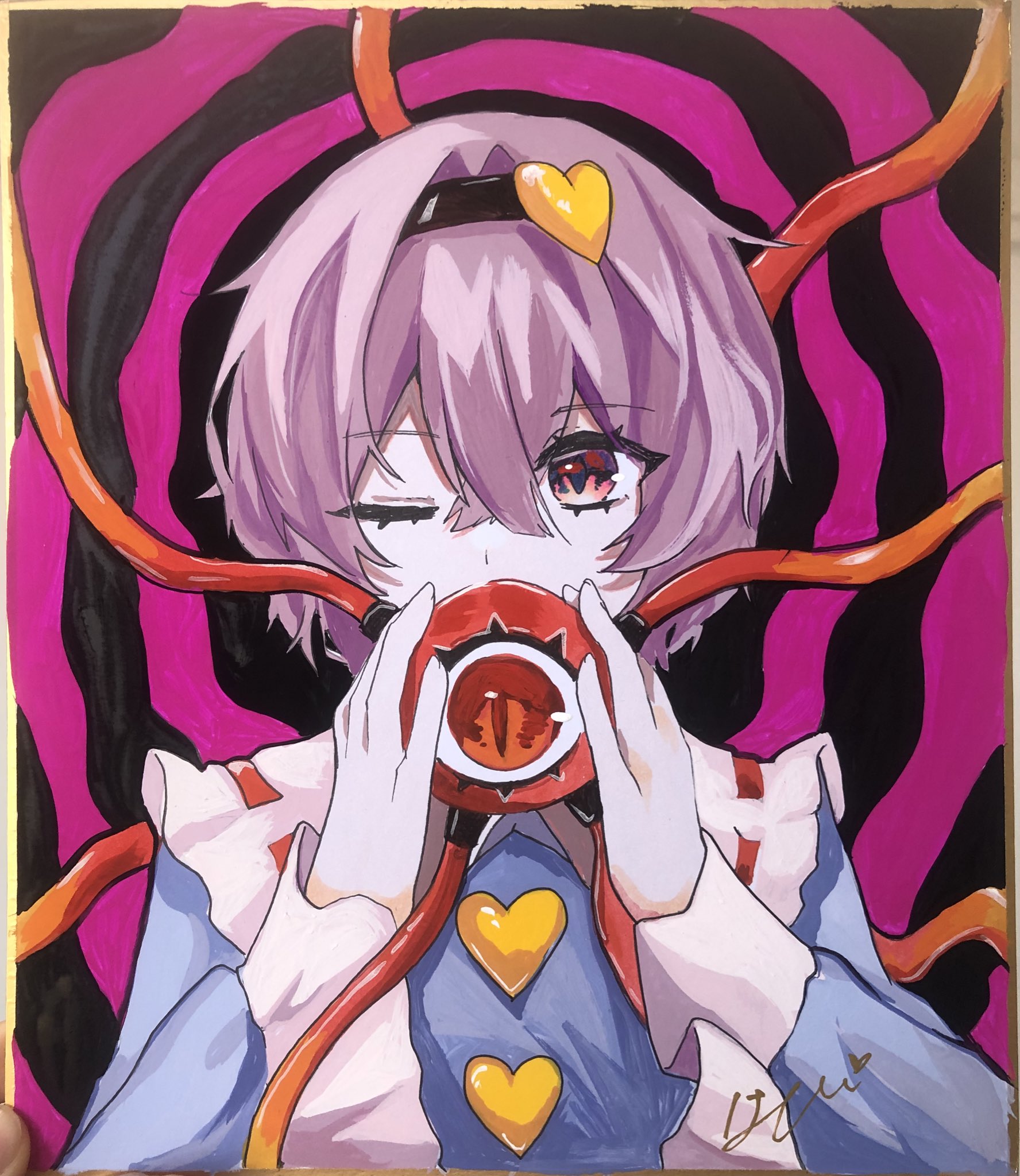 1girl blue_shirt buttons commentary_request covered_mouth crossed_bangs double-parted_bangs eyeball eyes_visible_through_hair fingernails frilled_shirt_collar frilled_sleeves frills hair_between_eyes hair_intakes hair_ornament hairband hands_up heart heart_button heart_hair_ornament highres holding holding_eyeball izumi_no_yasushi_aya komeiji_satori long_sleeves one_eye_closed pink_eyes purple_background purple_hair ribbon-trimmed_collar ribbon_trim shirt short_hair signature simple_background sleeves_past_wrists solo third_eye touhou traditional_media upper_body wide_sleeves