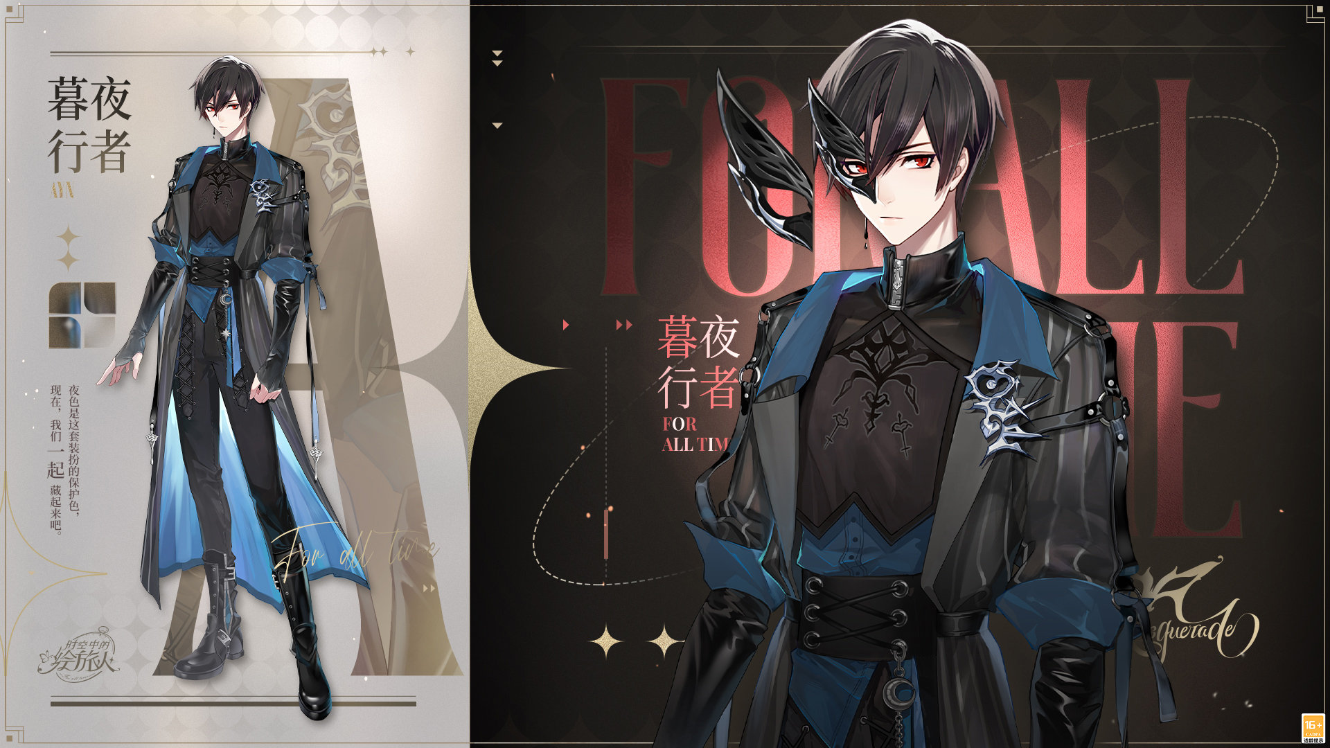 1boy alternate_costume arm_warmers arms_at_sides ayn_alwyn ayn_alwyn_(masquerade) black_arm_warmers black_background black_boots black_coat black_corset black_hair black_pants black_shirt blue_coat blue_shirt boots chinese_commentary chinese_text closed_mouth coat copyright_name corset crescent cross-laced_clothes cross-laced_pants domino_mask expressionless eye_mask full_body hair_between_eyes half_mask highres lapel_pin lapels long_sleeves looking_at_viewer lovebrush_chronicles male_focus mask notched_lapels official_art open_clothes open_coat pants red_eyes shirt short_hair solo sparkle_background standing striped_coat three-quarter_sleeves turtleneck two-sided_coat two-sided_fabric two-tone_background two-tone_shirt untucked_shirt vertical-striped_coat white_background zipper zipper_pull_tab zoom_layer