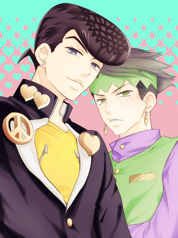 2boys black_hair blue_eyes commentary_request diamond_wa_kudakenai earrings frown gakuran green_eyes green_headband green_vest halftone halftone_background headband heart heart_background higashikata_josuke hisohiso_(altoblue) jewelry jojo_no_kimyou_na_bouken kishibe_rohan male_focus multiple_boys peace_symbol pompadour school_uniform stud_earrings vest zipper