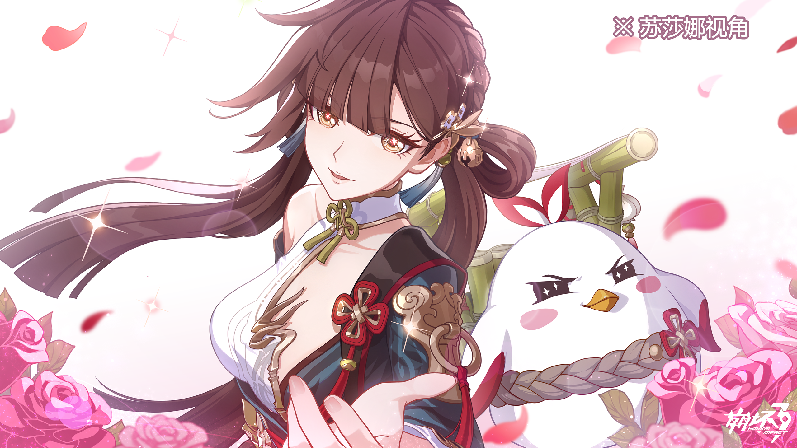 +_+ 1girl :d breasts brown_eyes brown_hair chinese_clothes flower hair_ornament highres honkai_(series) honkai_impact_3rd jingwei_(bird) li_sushang li_sushang_(peregrine_sword) long_hair looking_at_viewer medium_breasts official_art open_mouth petals pink_flower pink_rose rose smile solo very_long_hair white_background