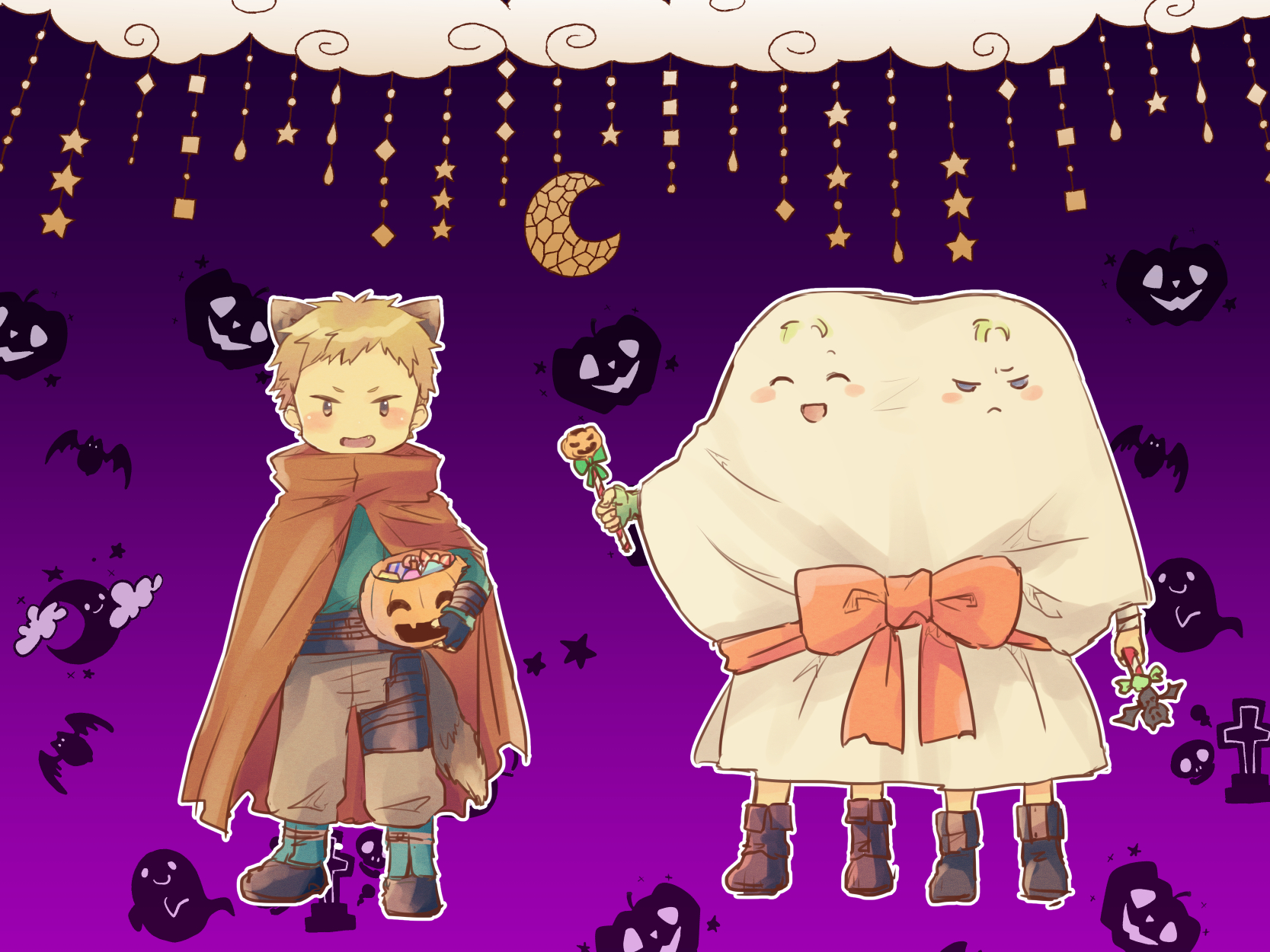 >:( 3boys animal_ears ankle_boots bat_(animal) blush blush_stickers boots bow brothers brown_cape brown_eyes brown_hair candy cape cat_ears chad_(fire_emblem) child closed_eyes cloud commentary_request crescent fake_animal_ears fingerless_gloves fire_emblem fire_emblem:_the_binding_blade food ghost ghost_costume gloves gradient_background halloween halloween_costume highres holding jack-o'-lantern looking_at_viewer lugh_(fire_emblem) male_focus multiple_boys nintendo nishimura_(shinchinagachi) no_sclera open_mouth pants partial_commentary purple_background raigh_(fire_emblem) shoes short_hair siblings smile square star_(symbol) v-shaped_eyebrows