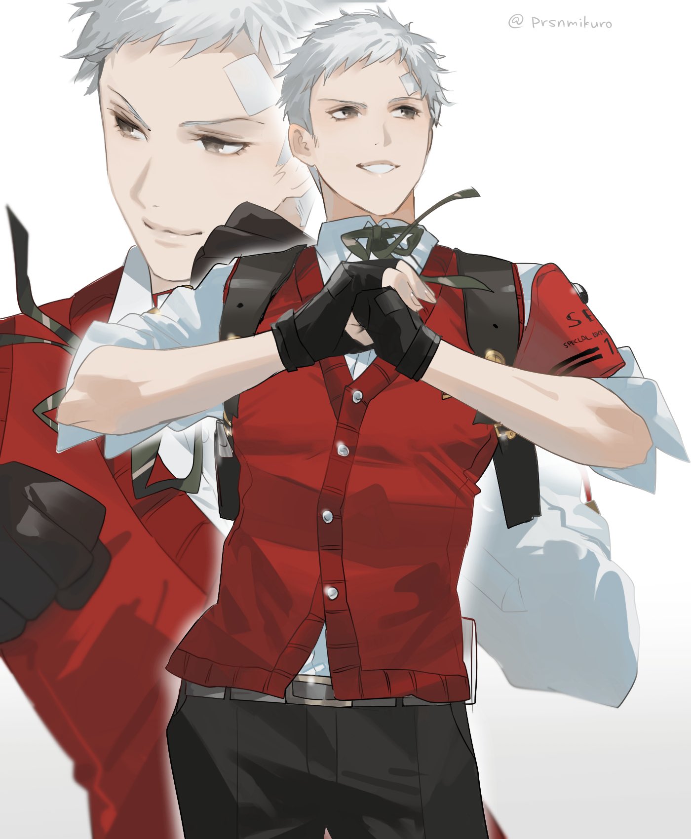 1boy armband bandaid bandaid_on_face bandaid_on_forehead belt black_gloves black_pants black_ribbon collared_shirt cowboy_shot fingerless_gloves gekkoukan_high_school_uniform gloves grey_hair highres looking_to_the_side male_focus multiple_views neck_ribbon own_hands_together pants parted_lips persona persona_3 persona_3_reload prsnmikuro red_armband red_sweater_vest ribbon s.e.e.s sanada_akihiko school_uniform shirt short_hair sleeves_rolled_up sweater_vest twitter_username upper_body white_background white_shirt